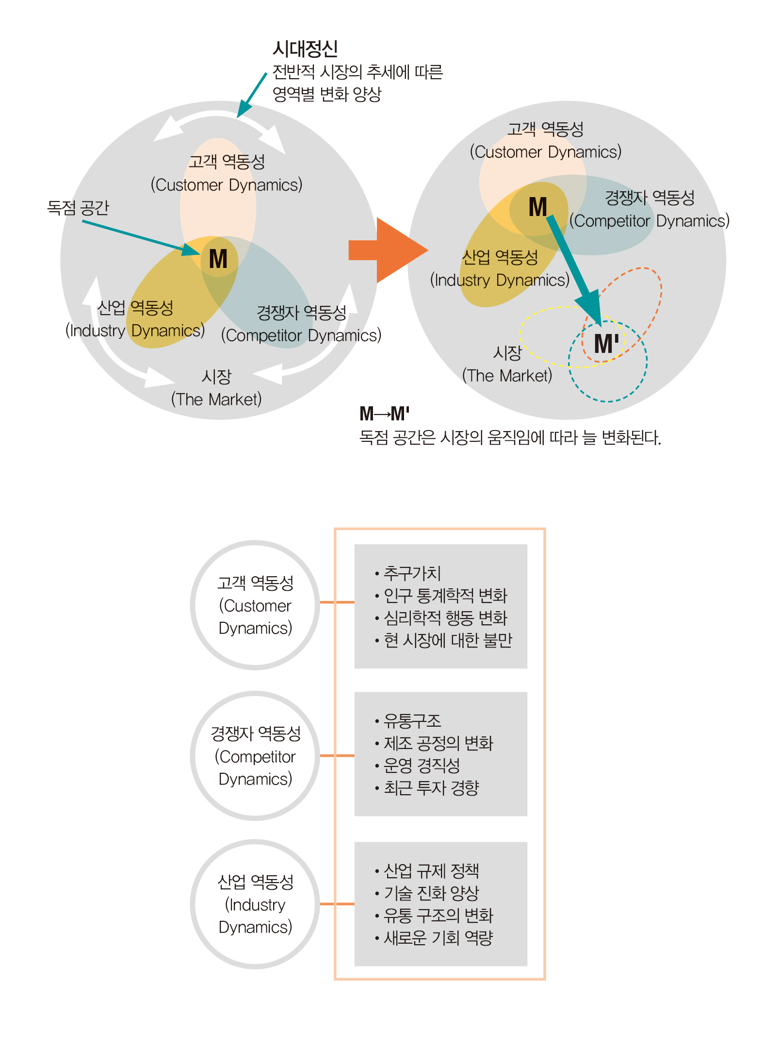 *독점 만화경 독점의 기술을 시장 전반의 트렌드에 의해 변화하는 고객, 산업, 경쟁자를 알아차리고 빈 곳을 알아차리는 것 : 미래의 독점 영역이 될 ‘빈 공간’을 찾아내는 방법을 묻자 그가 제안한 것이 The Monopoly Kaleidoscope, 즉 ‘독점 만화경’이었다. 만화경(萬華鏡)이란 (아마도 초등학생 때 준비물로 가져가 본 경험이 있을 것이다) 손아귀에 적당히 잡힐 만한 원통으로 그 안에는 보통 3개의 거울이 있고 그 거울은 바닥에 깔린 작은 색종이나 셀룰로이드 조각이 만들어 내는 모양을 비춰낸다. 그 모양이 천변만화(千變萬化, 끝없이 변화함)한다는 의미에서 만화경이란 이름을 갖게 되었다. 그에게 쉴 새 없이 변하는 고객, 산업 환경, 경쟁사를 설명하기에 이만큼 적합한 단어가 없었던 모양이다. 그 만화경(시장)속에서 고객 역동성 (Customer Dynamics), 산업 역동성(Industry Dynamics), 경쟁자 역동성(Competitor Dynamics)으로 빚어지는 움직임을 확인해야 한다는 것이다. 그 3가지 힘의 교집합 영역이 앞으로 독점해야 할 ‘빈 공간’이기 때문이다. 하지만 그 교집합 영역(빈 공간)은 늘 같은 자리에 있는 것이 아니라 고객, 산업, 경쟁자, 그리고 시장 전반의 트렌드에 의해 쉴 새 없이 변한다. 그곳을 알아차리는 것이 독점의 기술이다.
