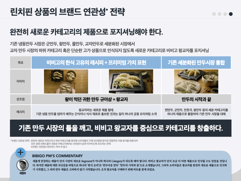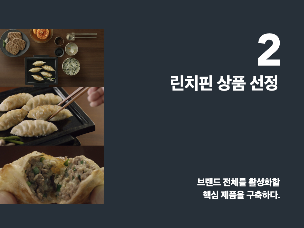 몇 년 전만 해도 햄은 불량식품으로 인식되어, 첨가물 이슈가 끊이지 않았습니다. ‘더(The) 건강한 햄’5 은 한 브랜드 매니저가 ‘원래 햄은 건강한 식품인데 오해가 많은 것 같다’며 편견을 극복해 보겠다고 해서 만든 브랜드입니다. 올바른 방향이었고, 방향성에 맞는 브랜드명이었기에 당시 내부에서 많은 지지가 있었습니다. ‘스팸(SPAM)’도 선물세트의 고급화와 그에 부합하는 브랜드 리뉴얼을 주장했던 브랜드 매니저가 있었기에 지금의 스팸이 되었습니다. ‘비비고 왕교자’는 3년간 냉동 사업이 잘 안 돼서 마음고생이 많았던 브랜드입니다. 그럼에도 성공한 이유를 저는 ‘브랜드 매니저와 브랜드팀의 고통’이라고 말합니다. 때로는 제품이 혁신적으로 앞서 나가거나 혹은 브랜드가 앞서 나가는 경우가 있습니다. 이때 브랜드 매니저가 잡아줘야 합니다. 무조건 혁신이 좋은 건 아닙니다. 변화에 맞추어 때로는 소비자를 리드하고 때로는 쫓아가면서 ‘어울림’을 만들어 나가야 합니다. 이처럼 성공한 브랜드 뒤에는 오랜 기간 마음 고생한 브랜드 매니저들이 있습니다.