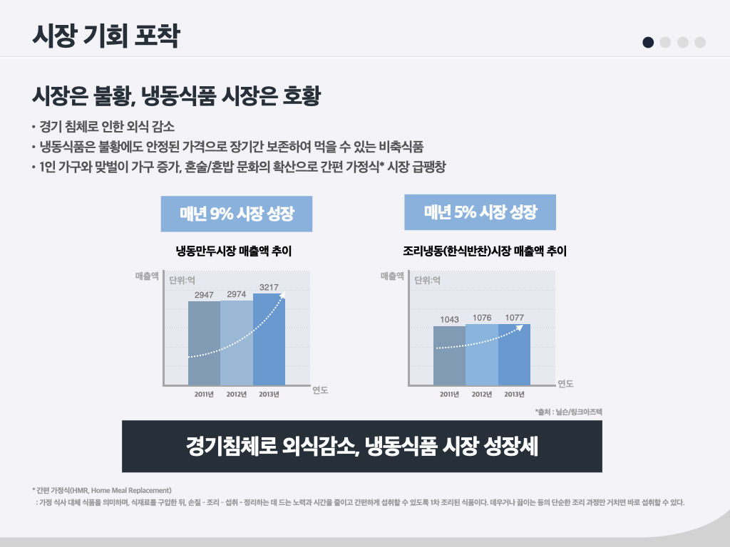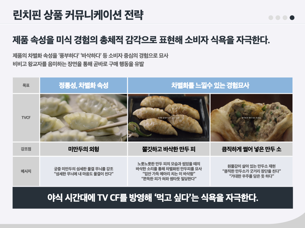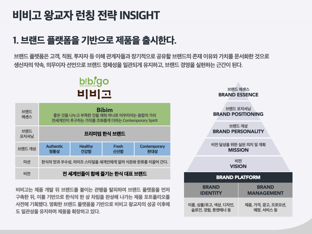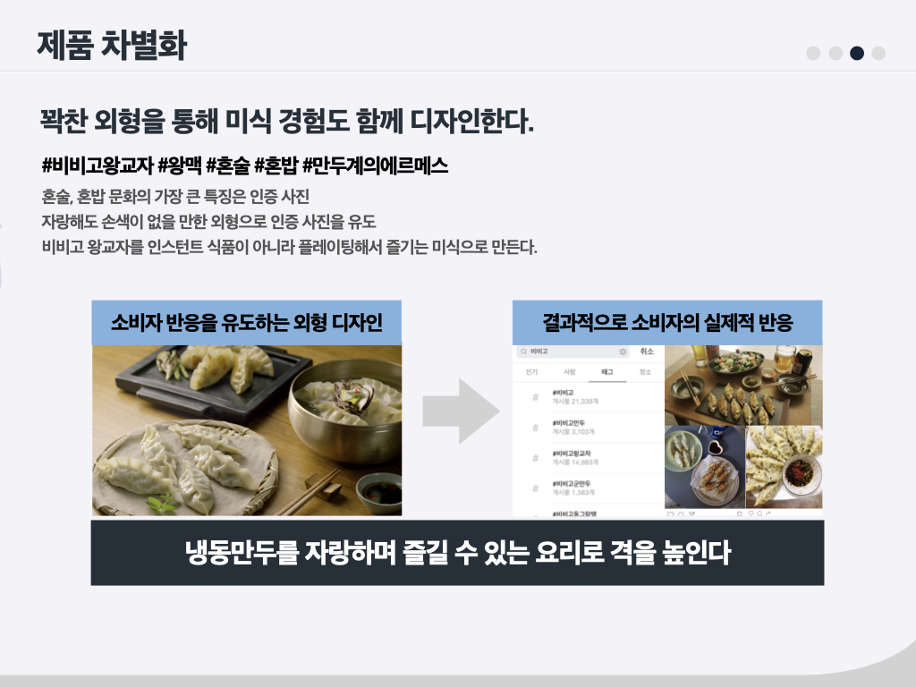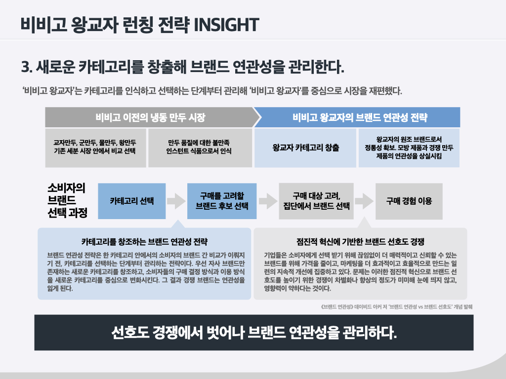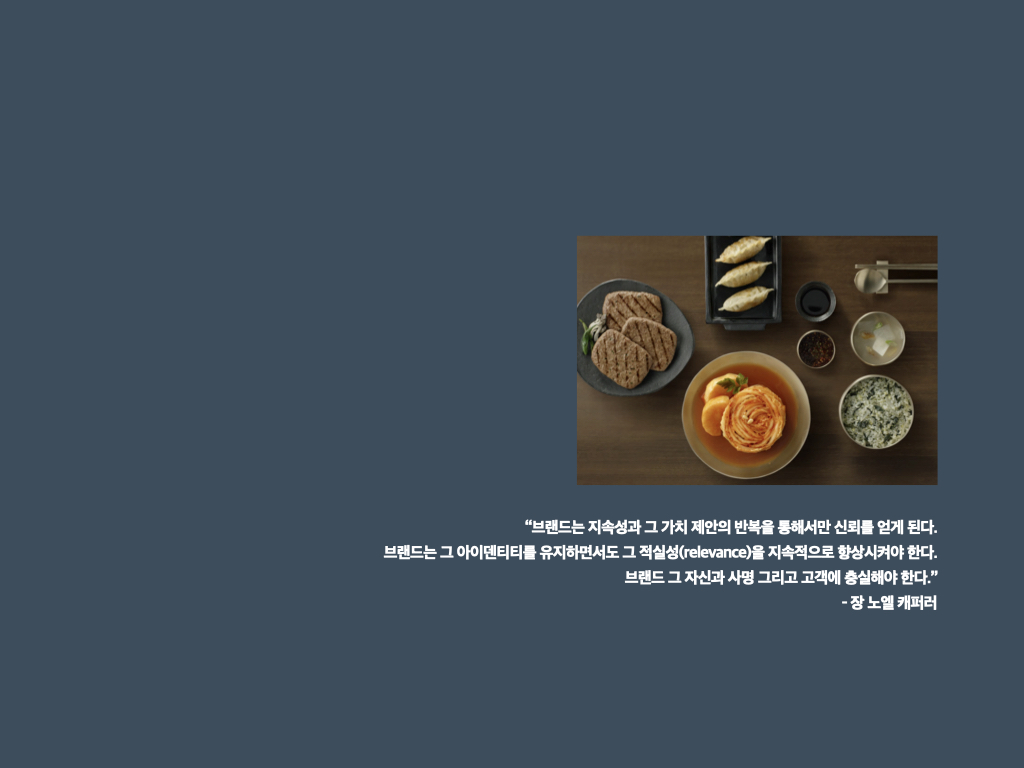 몇 년 전만 해도 햄은 불량식품으로 인식되어, 첨가물 이슈가 끊이지 않았습니다. ‘더(The) 건강한 햄’5 은 한 브랜드 매니저가 ‘원래 햄은 건강한 식품인데 오해가 많은 것 같다’며 편견을 극복해 보겠다고 해서 만든 브랜드입니다. 올바른 방향이었고, 방향성에 맞는 브랜드명이었기에 당시 내부에서 많은 지지가 있었습니다. ‘스팸(SPAM)’도 선물세트의 고급화와 그에 부합하는 브랜드 리뉴얼을 주장했던 브랜드 매니저가 있었기에 지금의 스팸이 되었습니다. ‘비비고 왕교자’는 3년간 냉동 사업이 잘 안 돼서 마음고생이 많았던 브랜드입니다. 그럼에도 성공한 이유를 저는 ‘브랜드 매니저와 브랜드팀의 고통’이라고 말합니다. 때로는 제품이 혁신적으로 앞서 나가거나 혹은 브랜드가 앞서 나가는 경우가 있습니다. 이때 브랜드 매니저가 잡아줘야 합니다. 무조건 혁신이 좋은 건 아닙니다. 변화에 맞추어 때로는 소비자를 리드하고 때로는 쫓아가면서 ‘어울림’을 만들어 나가야 합니다. 이처럼 성공한 브랜드 뒤에는 오랜 기간 마음 고생한 브랜드 매니저들이 있습니다.