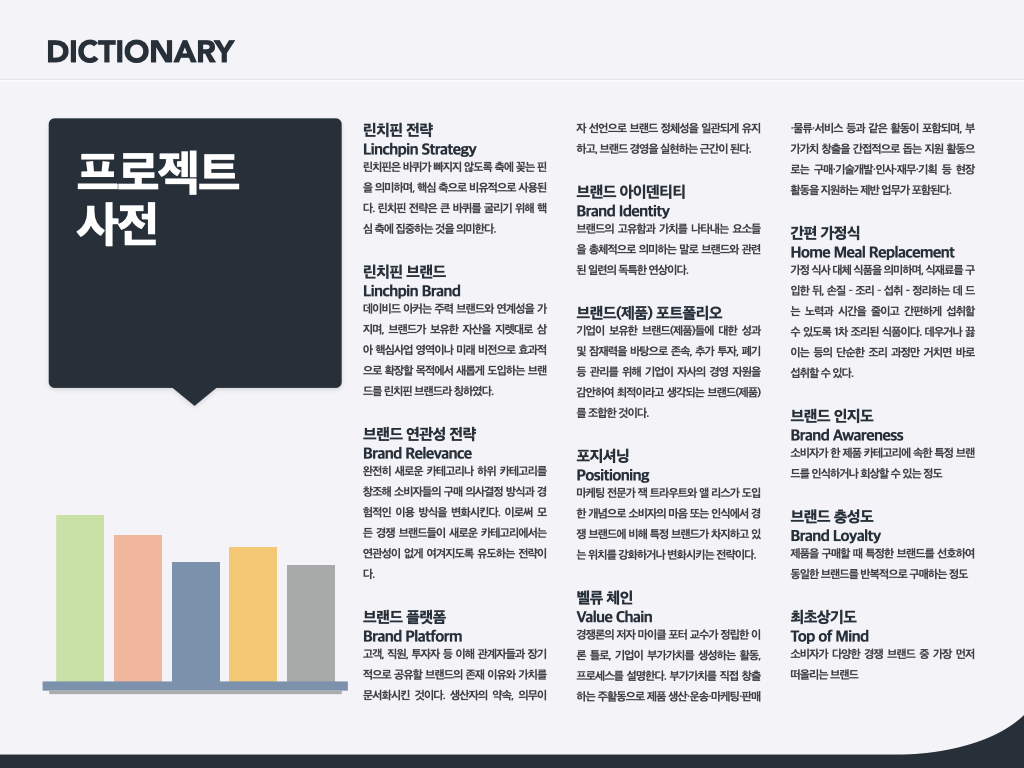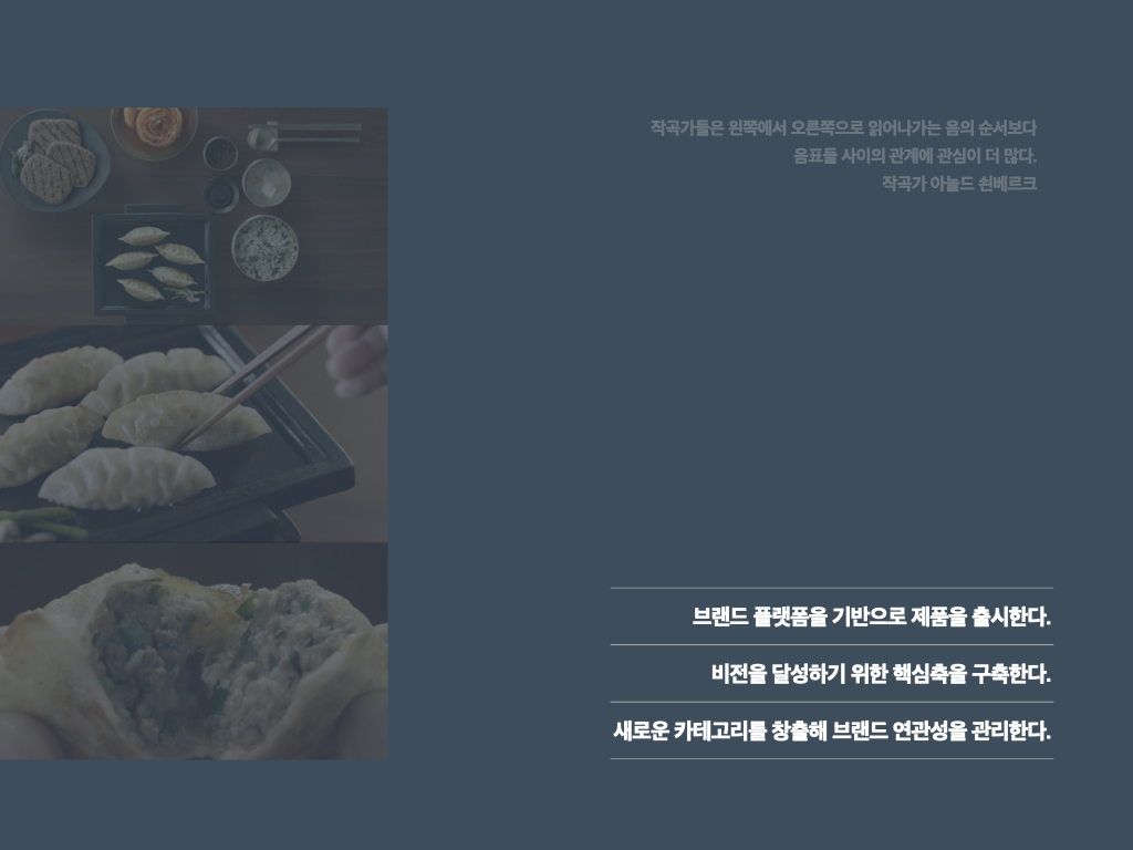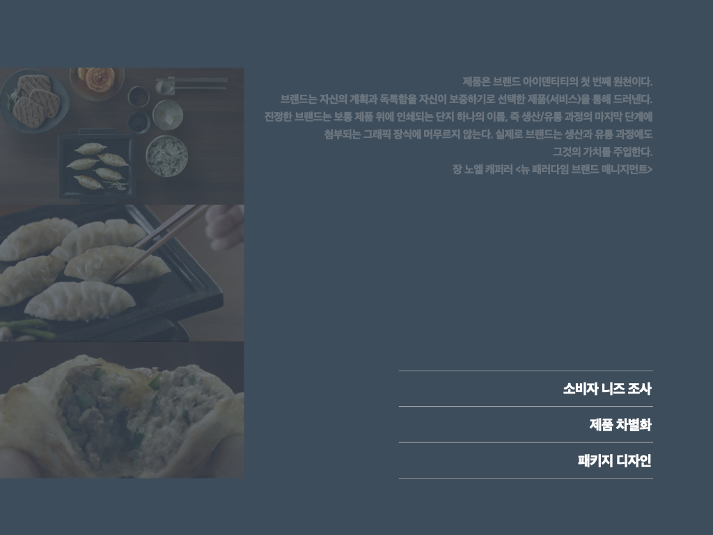 브랜드 매니저를 정의하면, ‘벨류체인(Value Chain)과 업(業)에 대한 이해를 바탕으로 벨류체인을 브랜드와 연결하여, 사람들에게 브랜딩함으로써 P/L(Profit and Loss)과 B/S(Balance Sheet)를 운영하는 사람’이라고 할 수 있습니다. 브랜드 매니저는 구매전략과 생산운영 전략, 영업의 채널 관리, R&D 제품 기술 진화방향도 함께 설계해야 합니다. 동시에 라이프스타일의 변화, 경쟁사의 움직임, 선진국의 동향, 유통과 미디어의 변화 등을 늘 관찰하고 브랜드 전략에 녹여야 합니다. 하 지만, 아무리 브랜드 기획을 잘해도 본질적으로 제품의 실체가 없으면 허상일 뿐입니다. 제품을 통해 브랜드를 잘 구현하고, 벨류체인을 구성할 줄 알아야 합니다. 그러기 위해서는 업의 핵심개념을 익혀야 하는데 이 과정이 꽤 깁니다. 가령 만두를 예로 들면 만두에 들어가는 모든 원재료인 부추, 돼지고기, 파, 마늘, 밀가루 등에 대한 이해가 있어야 하죠. 그리고 어떻게 만들어지는지 생산과정을 다 꿰차고 있어야 합니다. 어떻게 만두피를 얇게 해서 바삭함을 더할지, 두부라면 콩에 대해서, 햄이라면 돼지고기에 대해 전문가 수준으로 알아야 합니다. 적어도 1년 정도 사이클이 돌아야 한 제품이 어떤 벨류체인으로 생산, 소비되는지에 대한 기초적인 걸 알게 됩니다. 브랜드 매니저들은 브랜드를 기획하고, 매일 벨류체인에서 일어나는 일에 대응하고, 이해관계자를 설 득해가면서 방향을 잡아나갑니다. 이런 과정을 겪다 보니 이 직업은 ‘마감’이 없습니다. 늘 브랜드를 생각하죠.