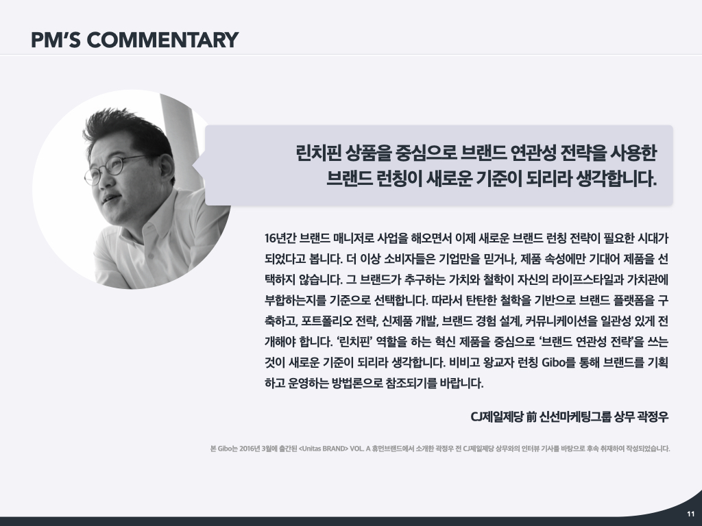 시대적으로 의미를 갖는 브랜드와 성공한 브랜드는 어김없이 모두 ‘열정’ ‘지루함을 버티는 힘’과 ‘어울림’을 갖춘 브랜드 매니저가 있었습니다. 2010년부터 2014년까지 저희에겐 굉장히 힘든 시기였습니다. 큰 매출 규모에 비해 브랜드 매니저의 수가 너무 적었고, 해야 할 일들이 매우 많았습니다. 하지만 그때 저에게 조금만 더 해보자고 격려해준 사람들이 바로 브랜드 매니저들이었습니다. 그분들이 지금도 계속 함께 하고 있고, 각자 성공신화들을 갖고 있죠. 이들이 버틸 수 있었던 건 열정과 서로를 위하는 어울림이었습니다. 그들은 결코 화려하지 않으며, 겸손합니다. 이를 바탕으로 벨류체인을 이해하고 리드해왔습니다. 그리고 지금 새로운 브랜드 매니저들이 그 DNA를 고스란히 이어받고 있습니다. 브랜드 매니저들 중 제가 가장 버티는 힘이 약하고, 어울림이 부족합니다. 다른 분들이 저를 잘 감싸 안아주어서 안 보일 뿐이죠. 좋은 브랜드 매니저들과 일한다는 건 제겐 ‘행운’입니다.