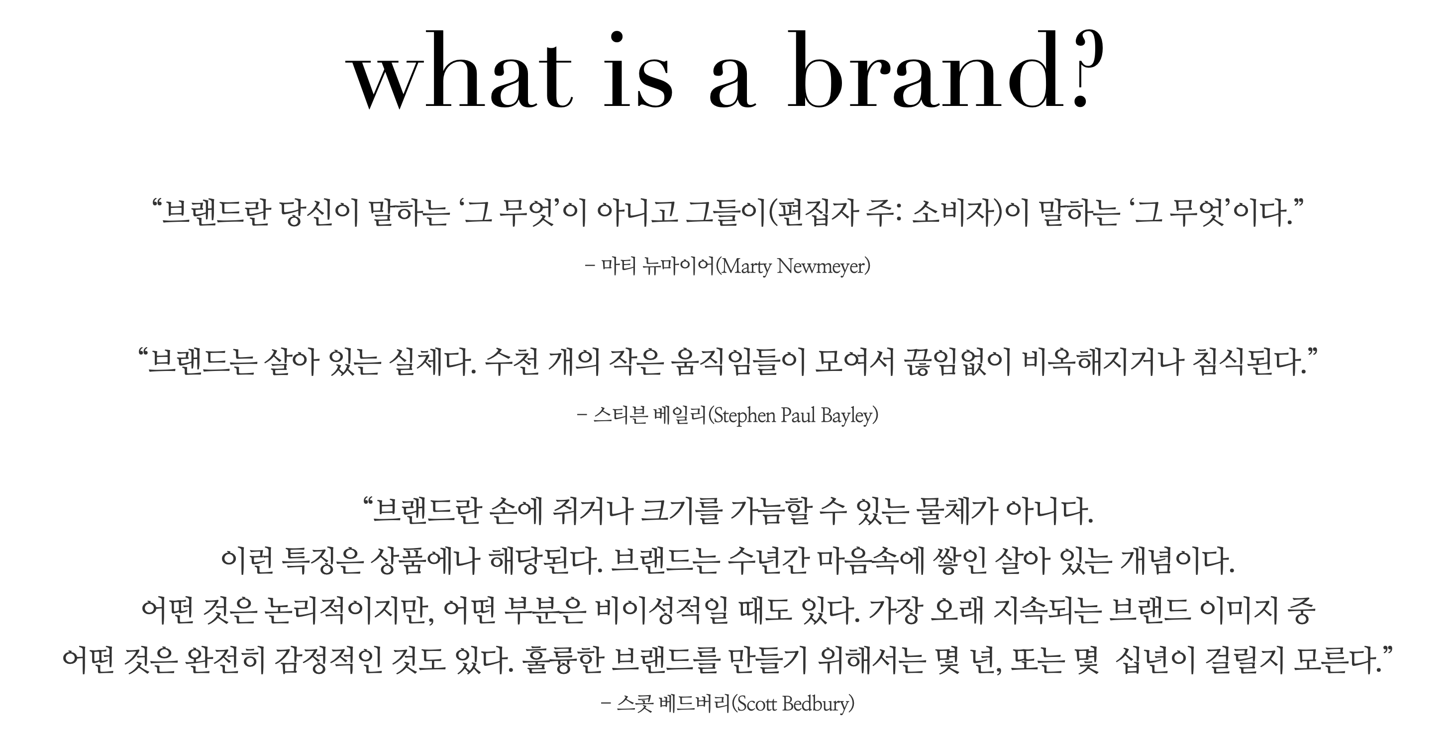 “브랜드란 당신이 말하는 ‘그 무엇’이 아니고 그들이(편집자 주: 소비자)이 말하는 ‘그 무엇’이다.”