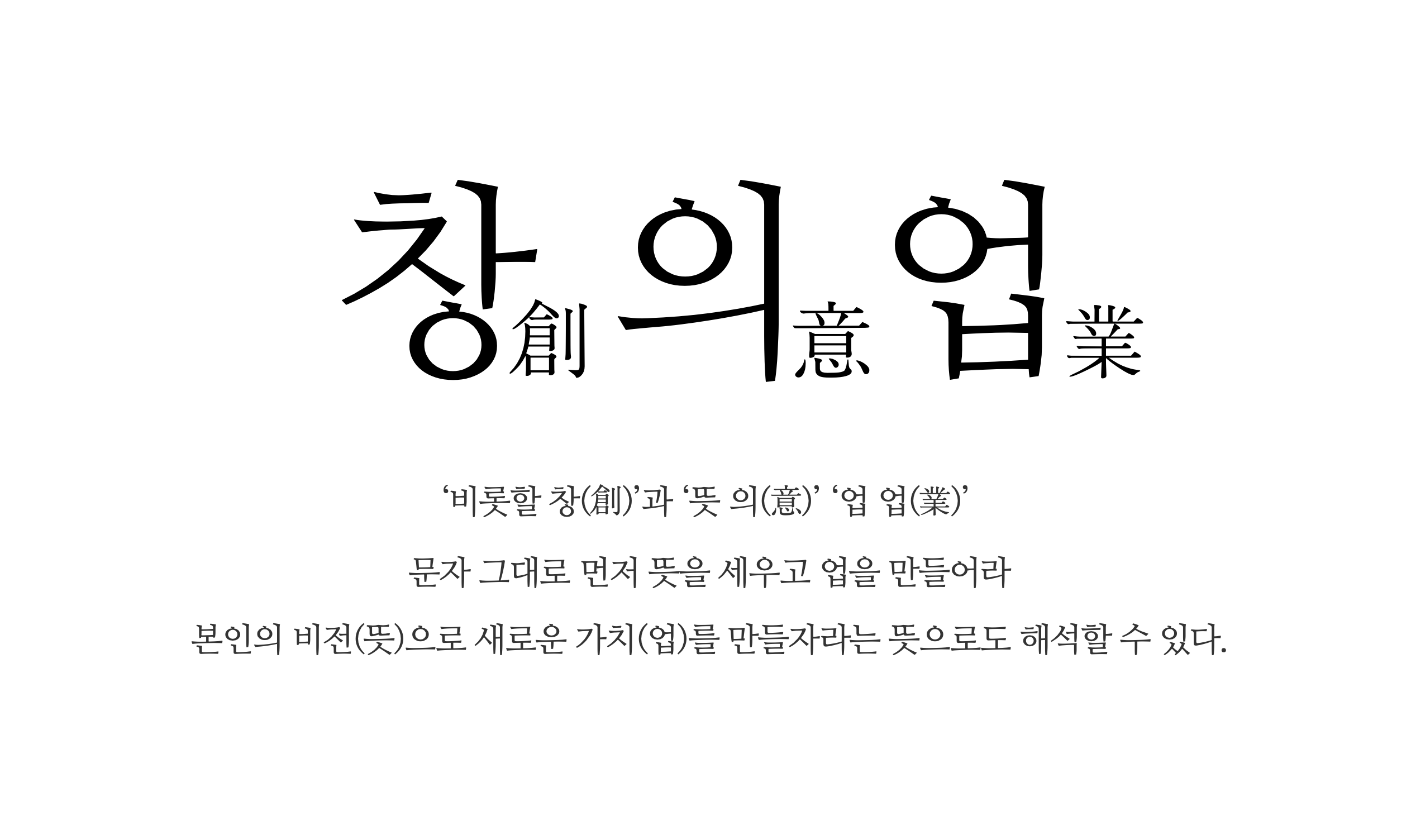 ‘창의업(創意業)’은 ‘비롯할 창(創)’과 ‘뜻 의(意)’ ‘업 업(業)’으로 구성된 신조어다. 문자 그대로 먼저 뜻을 세우고 업을 만들어라, 혹은 본인의 비전(뜻)으로 새로운 가치(업)를 만들자라는 뜻으로도 해석할 수 있다.