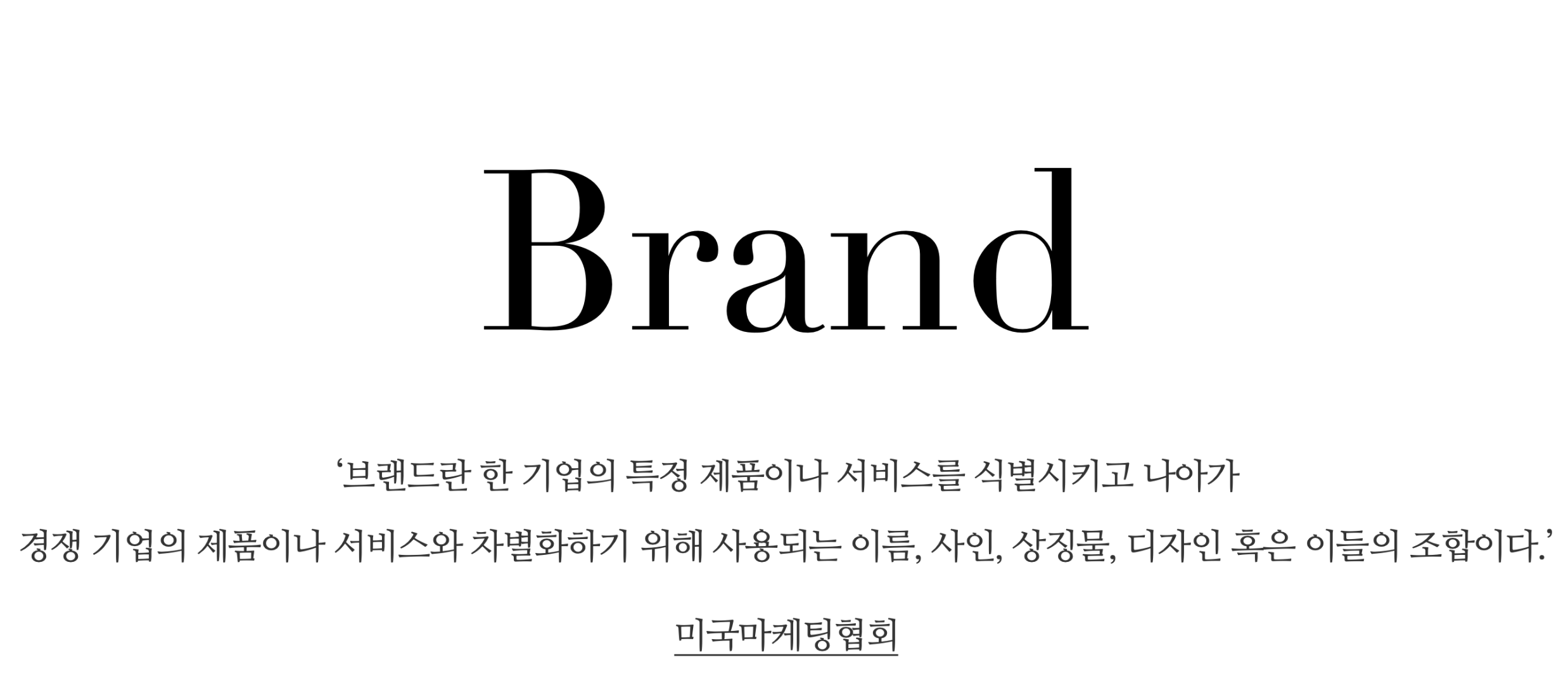 ‘브랜드란 한 기업의 특정 제품이나 서비스를 a.식별시키고 나아가 경쟁 기업의 제품이나 서비스와 b.차별화하기 위해서 사용되는 이름, 사인, 상징물, 디자인 또는 이들의 조합이다.’