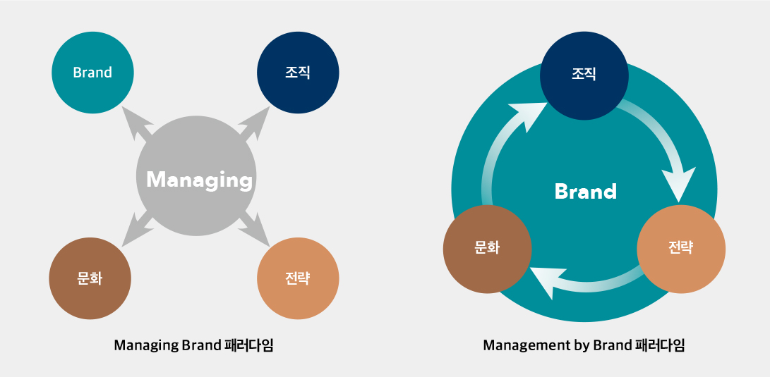 Management by Brand는 그동안 비즈니스에서 우선시 되어왔던 가격, 품질, 스피드, 전략적 투자와는 차원이 다른 패러다임으로, 부서별로 목표에 따라 열심히 해온 비즈니스 활동을 브랜드 관점에서 일관적으로 통합하여 운영하는 것이다.