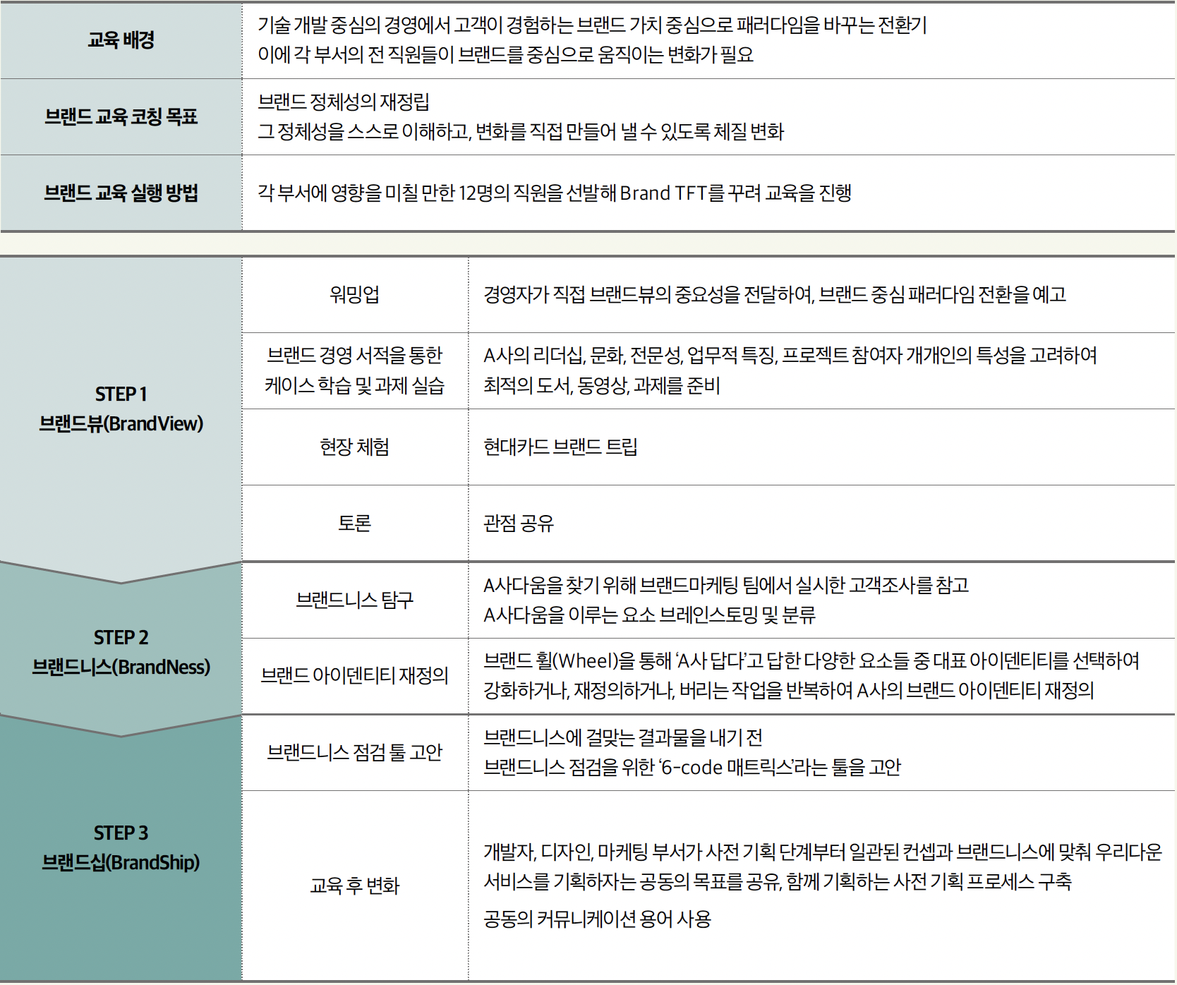 A사 브랜드 교육 코칭 프로그램 브랜드 관점으로의 패러다임 전환은 성숙된 시장에서 치열한 경쟁을 치르는 기업들이 맞닥뜨리는 자연스러운 현상이다. 이제 고객들은 상품과 서비스 이상의 것을 요구하기 때문이다. 이러한 브랜드 경영으로의 패러다임 전환기에서, A사는 중장기 브랜드 전략을 수립하는 컨설팅을 의뢰하였다. 하지만 A사에게 필요한 것은 보고서가 아니라 전사적인 체질 변화라는 공감대를 바탕으로 컨설팅 대신 브랜드 교육을 진행하였다. 다음은 A사에서 진행된 브랜드 교육 코칭 프로그램 사례이다.