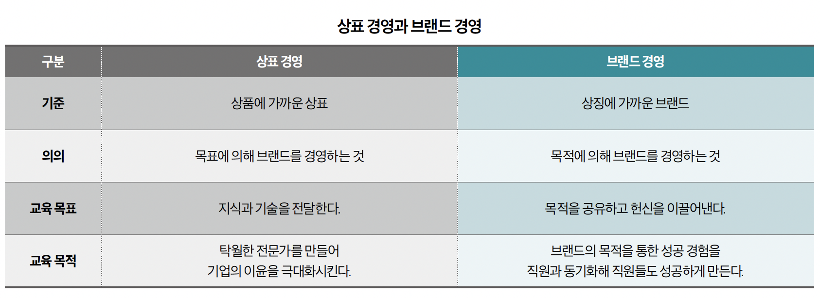 브랜드 교육의 목표는 브랜드 매뉴얼을 완벽하게 숙지하는 것이 아니다. 브랜드의 사명선언서를 직원의 소명과 동기화시키고, 직원 스스로 브랜드가 되어 자신의 브랜드를 가치 있게 소개(판매가 아니다)하도록 만드는 것이다. 이로써 소비자는 이 과정에서 상품의 품질을 느끼는 것이 아니라 브랜드의 품격과 품성을 느끼게 된다. 즉 브랜드가 된 직원의 서비스는 소비자가 브랜드를 감동으로 만나게 하는 ‘관계의 연결 고리 역할’을 한다. 이런 직원을 통해서 *브랜드는 영혼(Spirit)을 가지게 된다. 목표가 이끄는 기업은 교육을 통해서 직원들에게 지식(Content)을 전달하지만, 목적이 이끄는 브랜드는 교육을 통해서 목적을 공유하고, 직원들의 헌신(Commitment)을 이끌어낸다. 그들의 헌신은 무한 경쟁에서 생존할 수 있는 차별화의 시작이다.