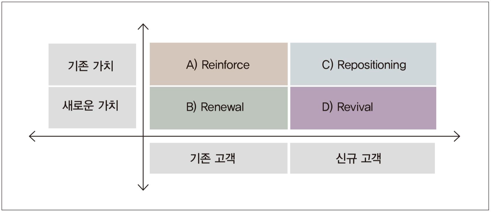기존의 가치로 신규 고객을 공략하는 전략이다. 이것은 고객의 변화에 따라서 그 변화를 따라가지 않고, 즉 기존의 고객을 버리고 새로운 고객에게 자신의 가치를 소구하는 전략이다. 우리는 여기서 리포지셔닝과 뉴포지셔닝을 개념 정리하지 못해 또 한 번 언어의 혼동에 빠질 위험이 있다. 리포지셔닝과 뉴포지셔닝은 ‘리’와 ‘뉴’ 차이로 같은 개념이다.