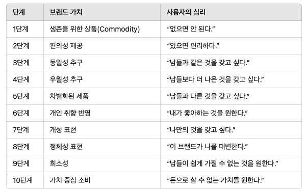 이 모델은 브랜드가 단순한 제품 식별을 넘어, 사용자의 정체성과 연결되는 과정을 보여준다. 브랜드 경영은 결국 상품을 ‘구별’하는 것에서 시작해, 사용자의 ‘가치’를 완성하는 것으로 발전해야 한다.