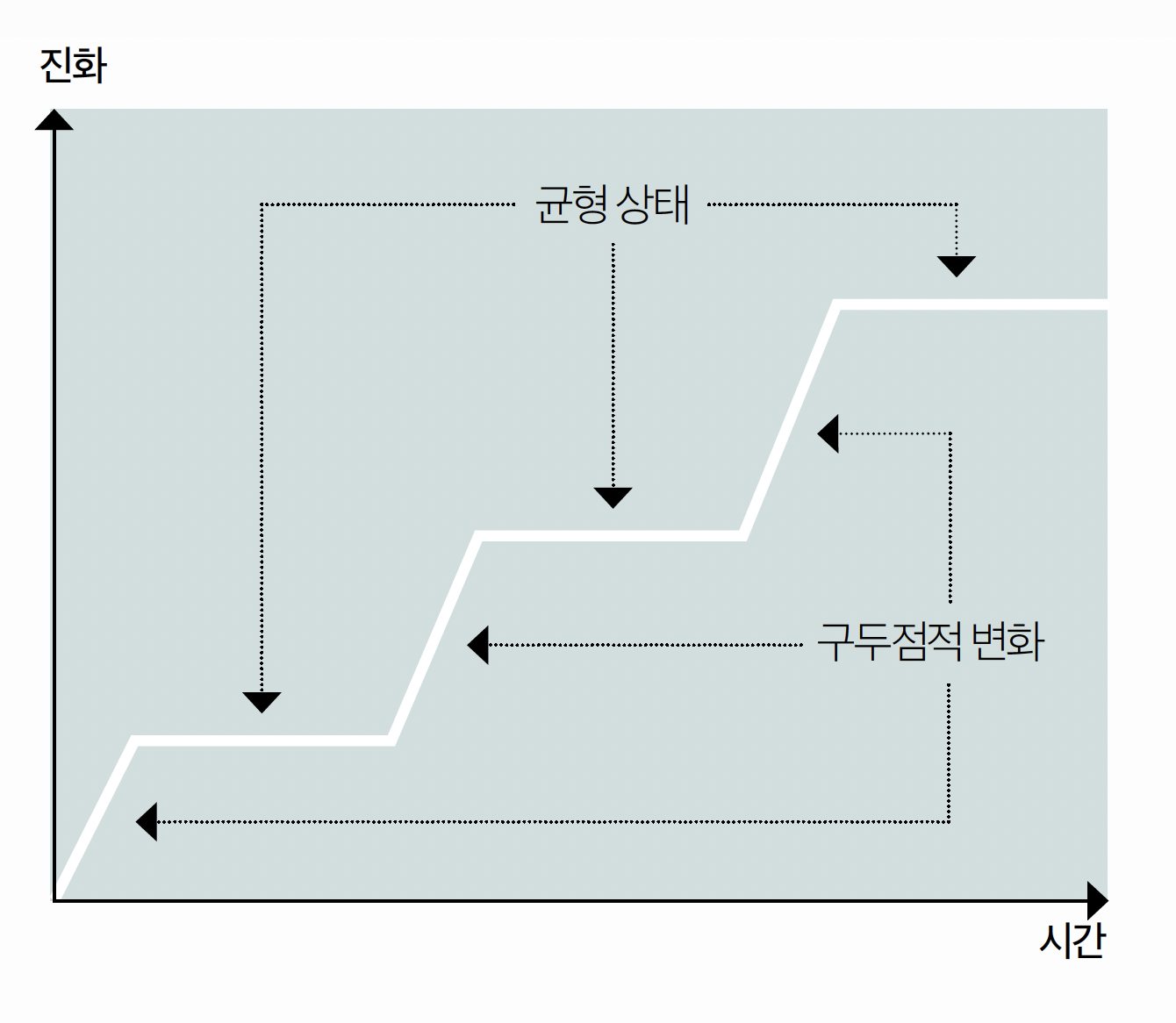 *구멍 뚫린 평형과 구두점식 평행이론 구두점식 평형이론(Punctuated Equilibrium Theory)은 생태계가 진화하는 과정에 대한 관점 중 하나로 점진적 계통 진화(Phyletic Gradualism)의 대안으로 만들어졌다. 생태계가 1차 함수 그래프 형태로 점진적으로 변화한다는 시각과는 달리 구두점식 평형이론에서는 생태계가 급진적인 변화를 겪으면서 단계적으로 진화한다고 보았다. 이 이론을 조직 단속평형이론으로 적용하기도 한다(Gersick, 1991). 균형 상태(Stasis)에서는 기본적인 행위 패턴이 지속되다가 구두점적인 변화를 겪고, 그 변화에서 다시 평형을 찾으면 한 단계 성장한다고 보는 것이다. 패트릭 한론은 구두점적인 변화를 리더가 바뀌거나 사라지는 것(시기)으로 보았고, 이 혼란에서 다시 평형을 찾게 하는 것이 브랜드 문화의 힘이라고 보았다.
