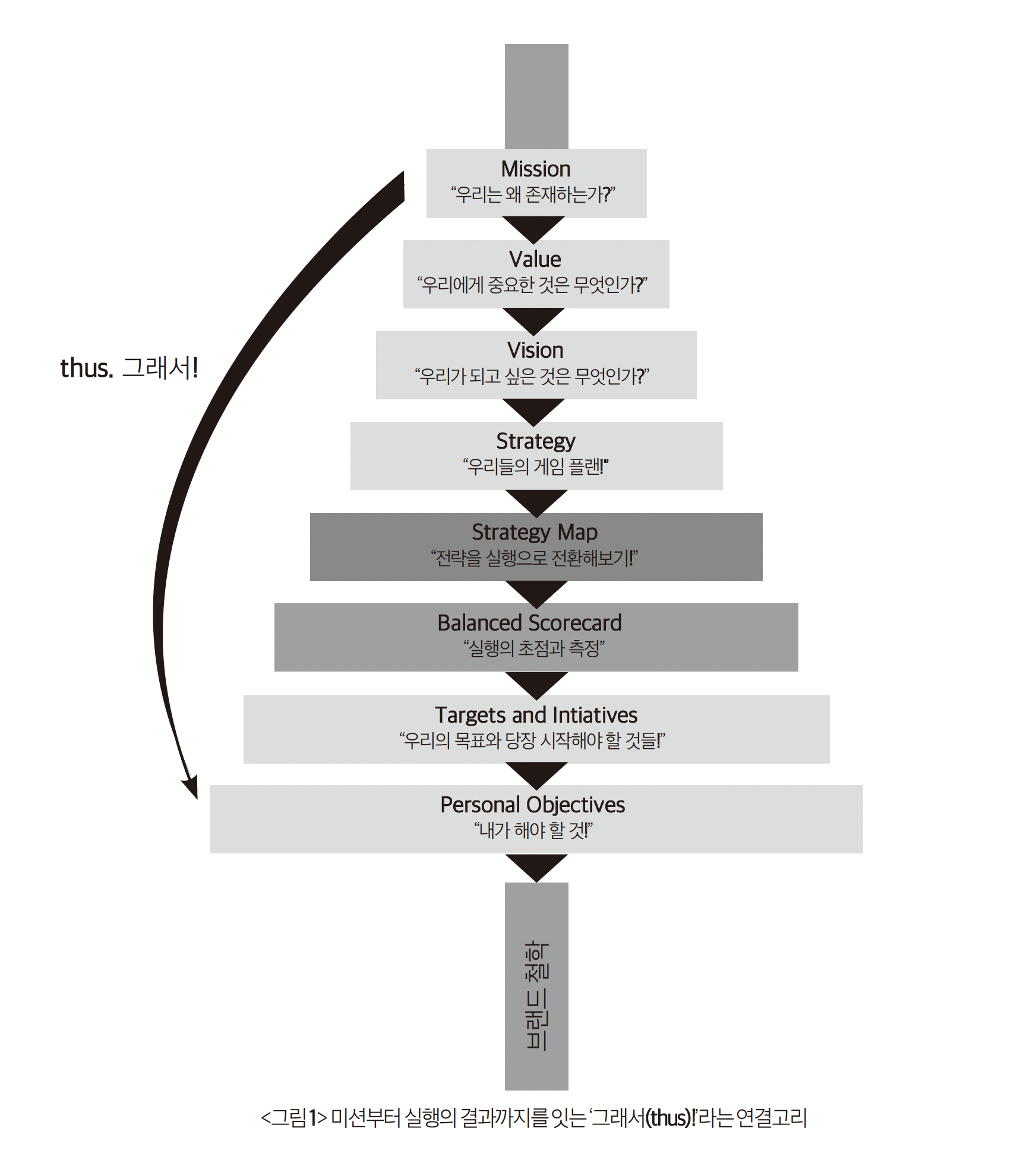 사실 핵심가치, 비전, 전략, 전술 등 브랜드 경영의 요소들은 브랜딩을 위한 것, 즉 우리 기업의 존재 이유(미션)를 어떻게 하면 최대한 효율적이고 효과적으로 전달할까에 대한 고민에서 파생된 것이라 할 수 있다. 예를 들면 “우리의 미션은 A다. ‘그래서’ 우리에게 가장 중요한 핵심가치는 B이며, 이를 구체화하기 위해 C라는 비전을 세운다. ‘그래서’ D라는 전략과 전술을 실행할 것이다”라는 문장을 만들 수 있어야 한다. 즉 기업 활동의 모든 것을 ‘그래서’로 연결했을 때 어색함이 없는, 명확한 시퀀스(Sequence, 자연스런 귀결)를 느낄 수 있어야 하는 것이다.
