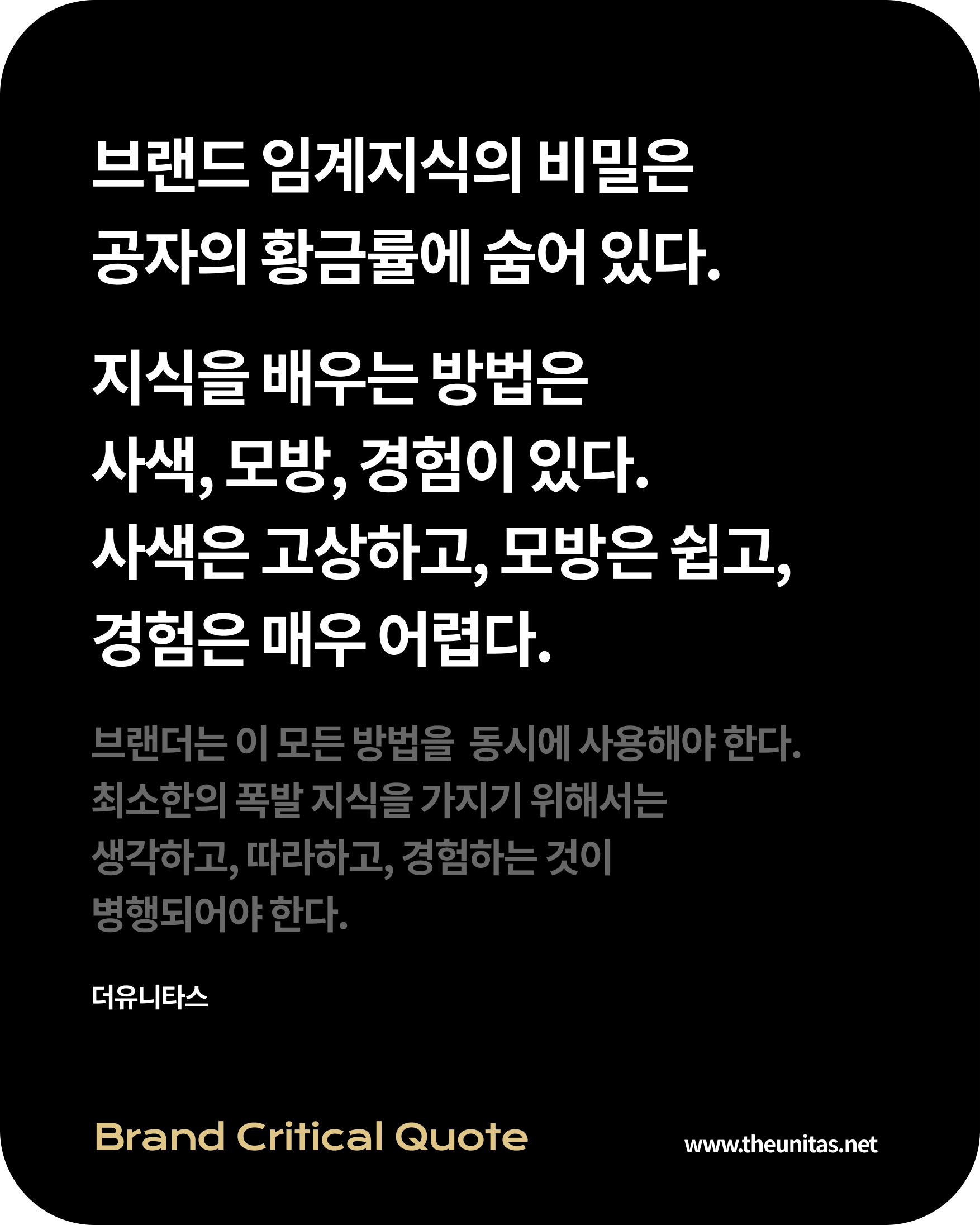 "물리학의 임계점에서 차용한 ‘브랜딩 임계지식 명언’이란 단어는 브랜딩 이론과 시장의 사실이 완전히 일체화되기 직전의 경계 지점에서 ‘하나의 선으로(한 문장으로)’ 뽑아낸 글이라고 말할 수 있다."