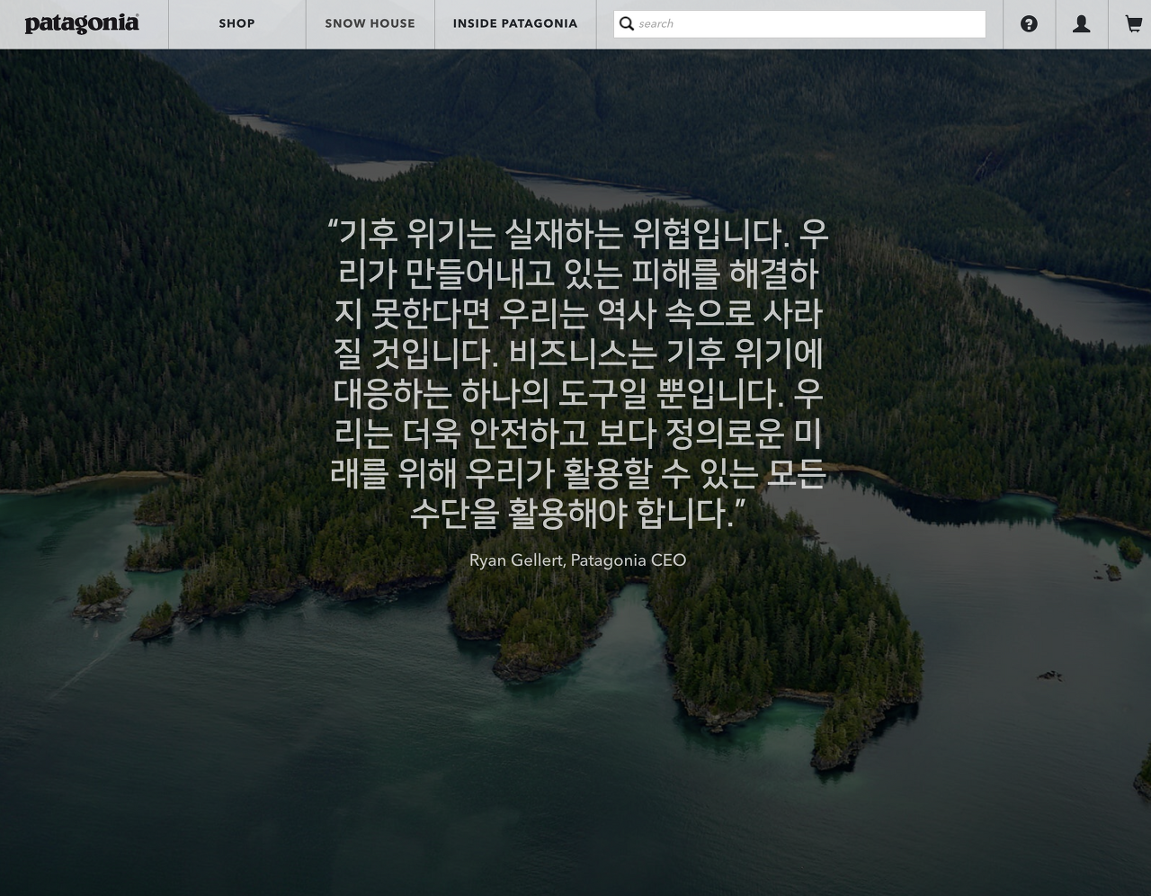 이 문장을 가지고 그들의 사이트와 매장을 보면 많은 것이 보인다. 더 중요한 것은 파타고니아를 좋아하는 사람들의 커뮤니티가 실제로 이 기준으로 움직이는가다. 또 지구 환경을 위해 일하는 사람들이 파타고니아를 실제로 입고 좋아하는지도 살펴볼 필요가 있다.