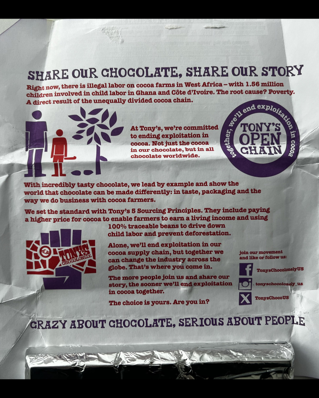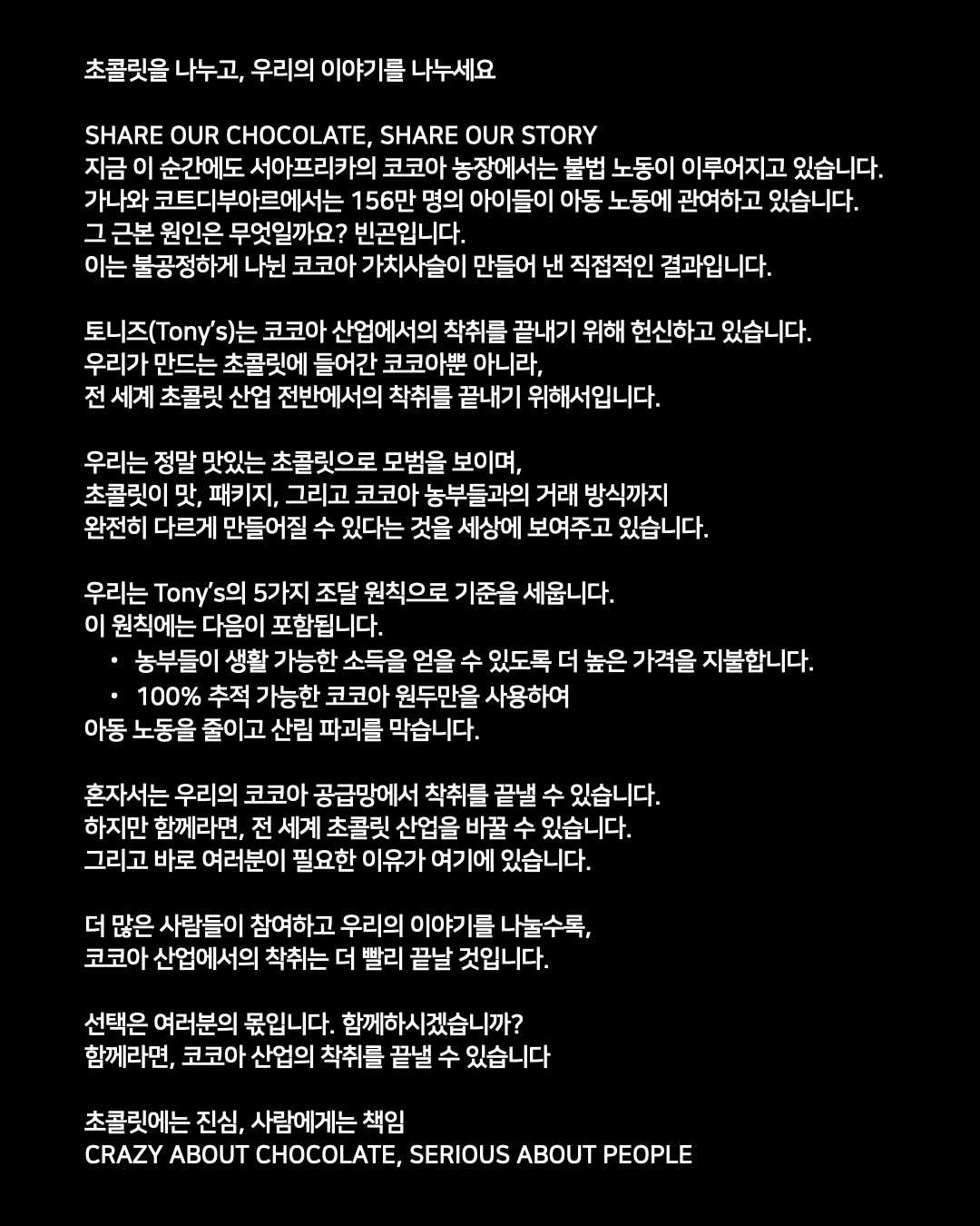 예를 들어, 제가 가장 탁월한 사회혁신 브랜드 가운데 하나로 보는 토니스 초콜로니(Tony’s Chocolonely)는, 브랜드가 작동하는 공식의 순서가 ‘반대로’ 설계되어 있습니다.