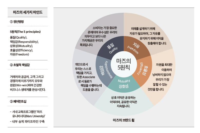 마즈는 1911년 설립되어 올해로 105번째 생일을 맞이한 브랜드로 연간 매출 35조 원의 글로벌 기업이다. 세계적인 규모의 기업임에도 마즈가 일반인들에게 잘 알려지지 않은 이유는 프라이빗 기업(Private Company, 비공개 기업)이기 때문이다. 마즈 가문은 어떤 이익에 의해서 기업이 좌지우지되는 것이 아니라, 창업 때부터 지켜온 ‘철학과 원칙’으로 기업을 성장시키는 것이 더 중요하다고 생각했다. 마즈는 이 ‘철학과 원칙’을 ‘5원칙(The 5 Principles)’이라는 핵심가치로 정립해 실천해오고 있다. 5원칙은 마즈가 원하는 기업의 모습이 무엇인지 명확하게 알려준다. 이 다섯 가지 원칙 중 어느 하나 중요하지 않은 것은 없다.