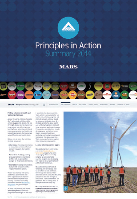 5원칙이 적용되는 주요 영역으로 ‘공 급망, 비즈니스 운영, 건강 및 영양, 직장 으로서의 역할’을 소개하고 있다.