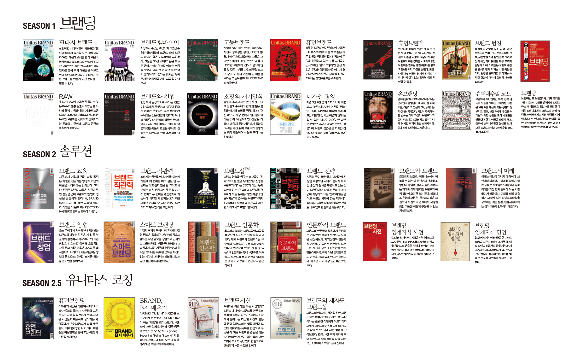 유니타스브랜드는 2007년 10월 창간이래 2012년 1월까지 ‘브랜딩’과 ‘솔루션’을 주제로 23권의 책을 시즌1과 2로 나누어 발행했다. 브랜드를 이해하고 브랜딩의 법칙을 찾기 위한 유니타스브랜드의 첫 번째 주제는 신화로 브랜드를 이해한 ‘판타지’였고, 마지막 주제는 인간의 가치로 브랜드를 인식하려는 ‘인문학’이다. 마지막 특집 주제인 ‘브랜드 인문학’도 上에서는 문사철(文史哲)을 중심으로 는 Brand Humanitas였고, 下에서는 브랜드 교양과목이라고 할 수 있는 과학, 미술, 미디어, 의학, 심리, 경제, 건축으로 구성된 Brand Lib-eral Arts다. 브랜드에 관한 지식을 이렇게까지 광범위한 주제들 사이에서 모으려고 했던 이유는 아래의 질문에 답을 하기 위해서였다.
