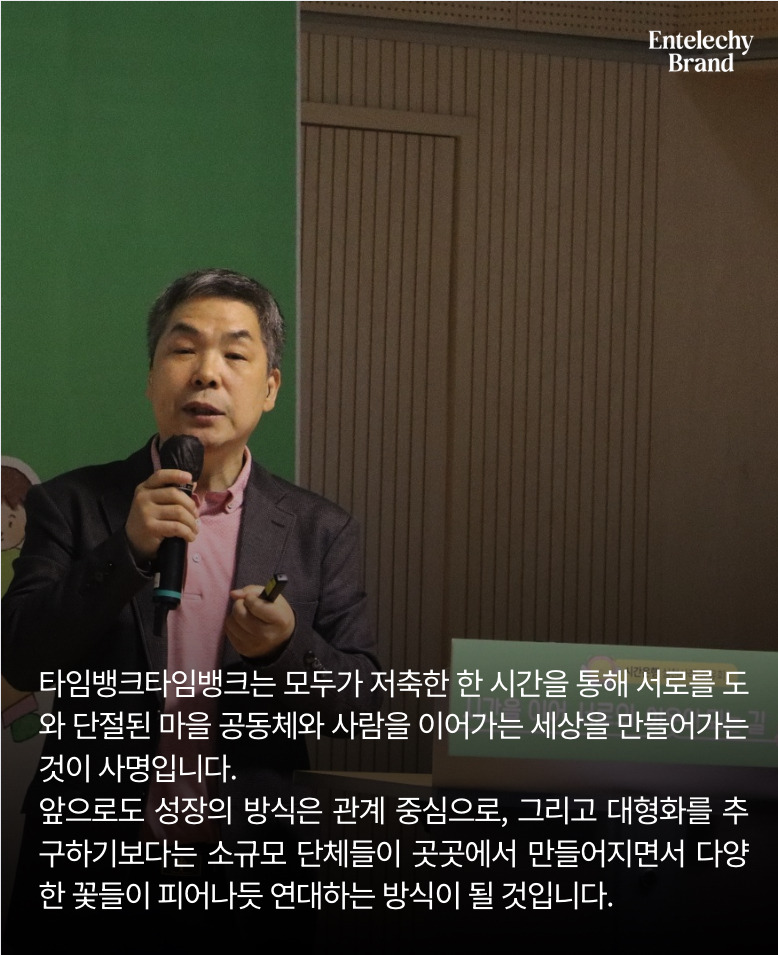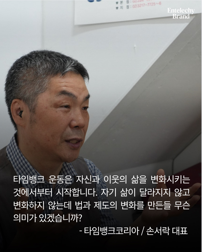 손서락 대표 : 타임뱅크는 '시간을 단위로 거래하는 공동체 기반의 시스템'입니다. 시간을 거래하는 은행이라고 생각하시면 간단해요. 돈을 주고받지 않고 이웃끼리 품앗이하듯이 도움과 도움을 주고받는 모임이죠. 남녀노소 누구나 참여할 수 있으며, 모든 도움은 시간 단위로 기록하고 저장합니다.