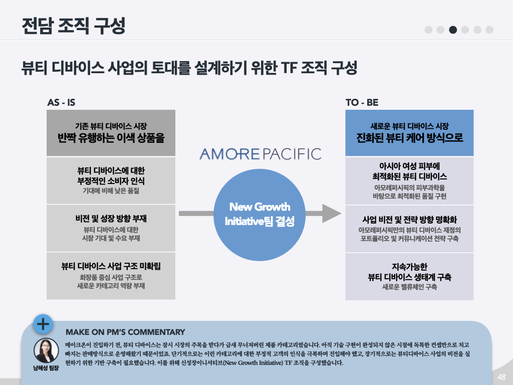 선행기획이라는 것이 어찌 보면 상상력을 이용해 구름 위에 집을 짓는 것처럼 느껴질 때가 있다. 자신이 구름 위에 있다고 두려움을 느끼는 순간 모든 기획은 무너지기 시작한다. 실패를 예감하는 순간, 미래보다는 현재의 경쟁구도 안에서 시장 선도자를 벤치마킹하기 때문이다. 그 순간 미래 그림은 사라진다. 이를 방지하기 위해서 선행 기획자는 스티브 잡스가 말한 것처럼 과거, 현재 그리고 미래의 점을 연결하면서 창의적인 미래에 관한 그림을 그려야 한다. 미래의 그림을 그리기 위해서는 확실한 점을 찾기 위한 시장조사가 필요하다. 아모레퍼시픽의 선행기획팀이 과거와 현재 그리고 미래를 연결했던 선을 살펴보자.