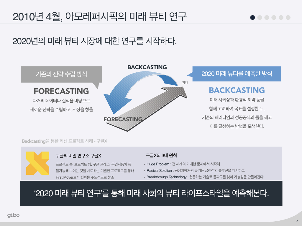 아모레퍼시픽의 선행기획팀에서 원하는 것은 통계가 아니라 통찰이었기에 과거의 데이터와 실적을 바탕으로 근접 전략을 수립하며 경쟁 구도를 예측하는 포캐스팅(Forecasting) 방법을 쓰지 않았다. 미래 사회상의 비전, 인류의 가치와 환경적 제약 등을 함께 고려하여 목표를 설정한 뒤, 기존의 패러다임과 성공 공식의 틀을 깨고 거꾸로 현실을 완성해가는 백 캐스팅(Backcasting) 방법을 선택했다.