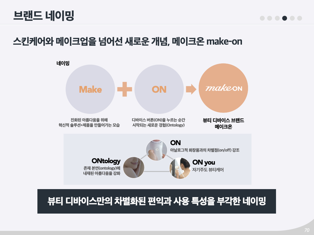 첫 번째, ON은 주체적인 뷰티 케어를 의미한다. 수동적으로 시술을 받는 것이 아니라 스스로 뷰티 디바이스를 사용해 가꾸는 Home-use 뷰티 디바이스의 특징을 설명하고 있다.