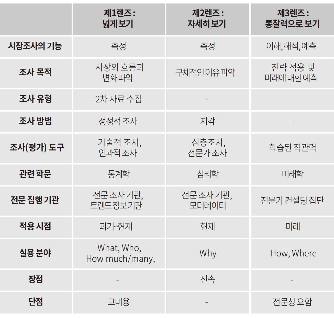 그렇다면 올바른 시장조사를 하기 위해서는 어떤 조사법을 찾아야만 할까? 결론부터 말하자면 세 개의 렌즈가 필요하다.