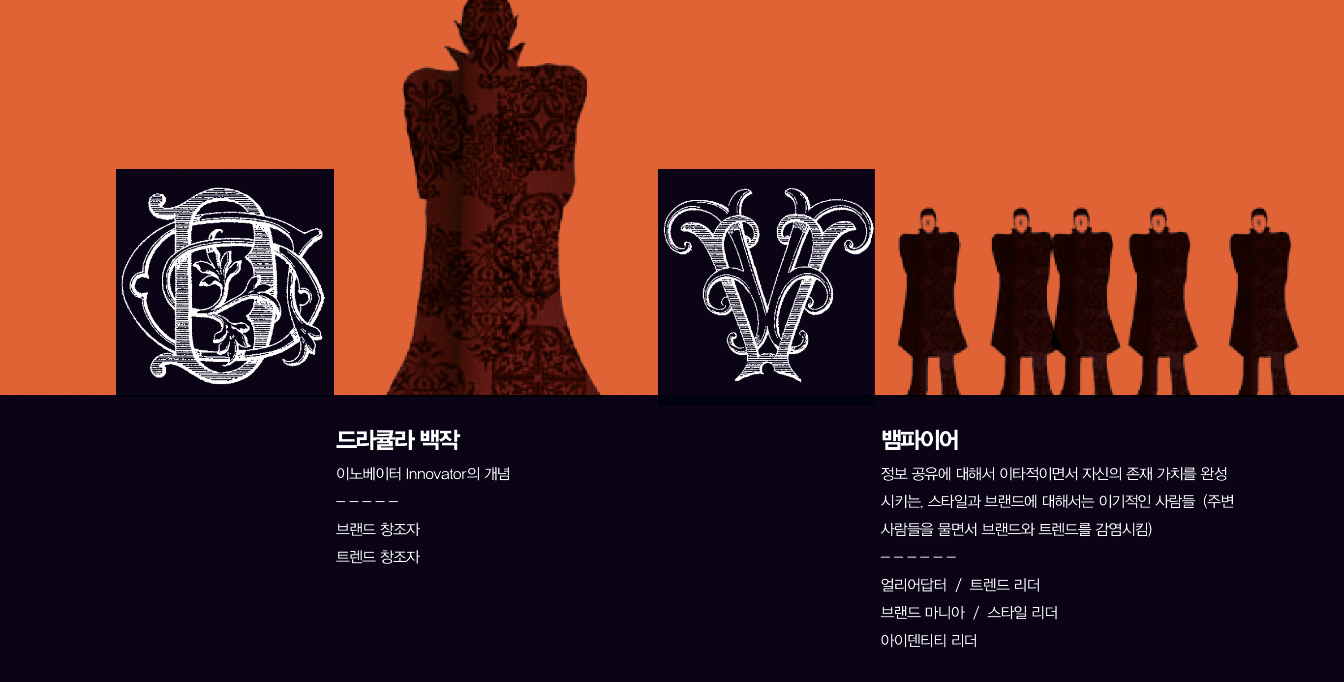 다른 사람에게 주목받기를 원하지만 자신이 밝혀지거나 자신의 것을 누군가 모방하면 그들은 사라진다. 정보 공유에 대해 이타적이면서 자신의 존재 가치를 완성시키는 스타일과 브랜드에 대해서는 이기적인 사람들…. 그래서 우리는 그들을 농담 삼아 뱀파이어라고 부르는 것이다. 그들은 자신과 가장 친한 주변 사람들을 물면서(자발적인 브랜드 홍보와 트렌드 권유) 다니기 때문이다. 자신의 이익과 관계없이 나서서 브랜드와 트렌드를 주변 사람들에게 감염시켰다. 물린 사람도 뱀파이어가 되어 특정 브랜드 혹은 특정 트렌드에 중독되거나 아직 멀쩡한 사람들을 찾아다녔다.