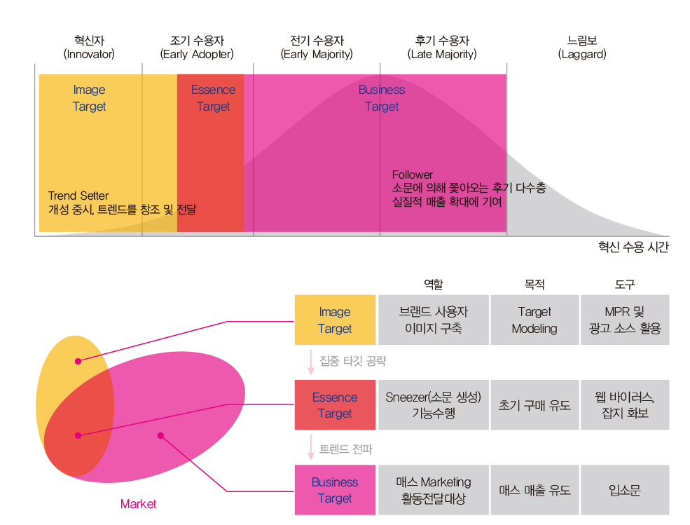 굳이 그림으로 그려 보라고 하면 아래의 표(트렌드 및 제품 수용이 일어나는 실제 모습)처럼 시장 안에는 무조건 신상품에 반응하는 얼리어답터(early adopter), 특정 브랜드에 대해서만 신상품을 선호하는 브랜드 어답터(brand adopter), 뉴욕과 도쿄의 트렌드를 소화한 뒤 명동과 압구정에서 트렌드를 재해석해 보여 주는 트렌드 리더(trend leader), 시장의 리딩 혹은 명품 브랜드에 맹목적인 브랜드 마니아(brand mania), 자신의 독특한 개성을 보여 주기 위해 트렌드와 브랜드에 상관없이 닥치는 대로 자기의 것으로 소화하는 스타일 시커(style seeker)들이 겹치고, 뭉치고, 범벅되어 있을 것이다.