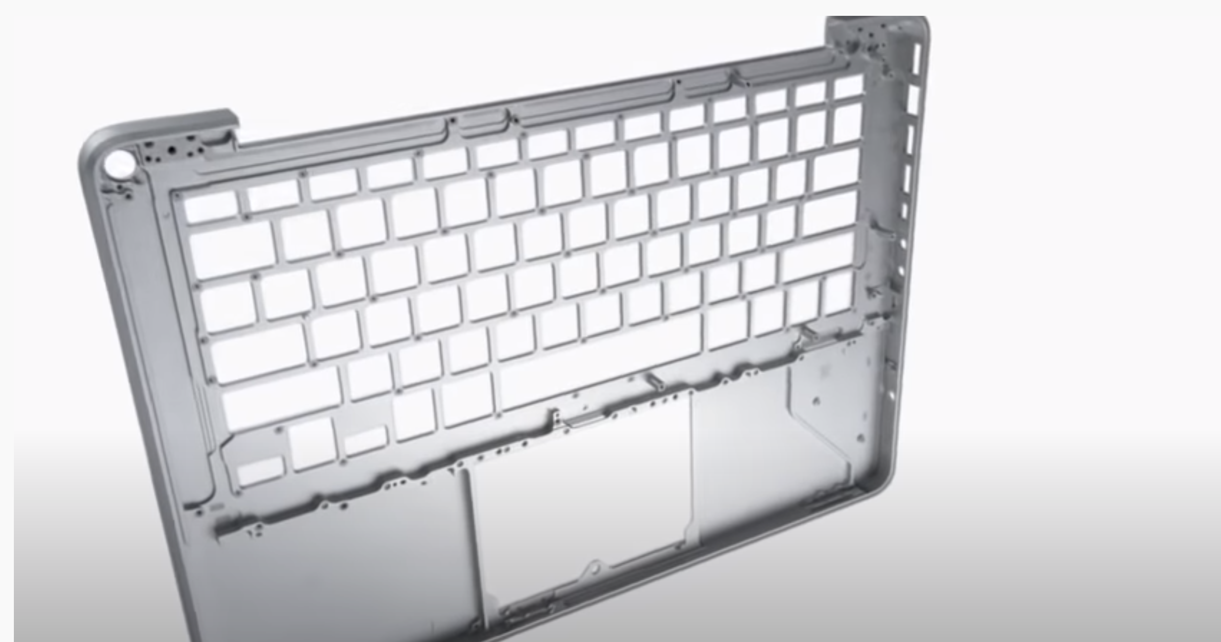 이 방법의 문제점은 크기와 무게를 증가시킨다는 것입니다. 그리고 그만큼 실패할 확률도 높아집니다. 새로운 Mac-Book을 제작하는 데 있어 가장 큰 돌파구는 여러 파트를 하나의 파트로 대체하는 것이었습니다. 우리는 그 하나의 파트를 unibody라고 명명했습니다. 우리가 고안한 방법으로 노트북을 근본적으로 더 얇고, 더 가볍고, 더 탄탄하게 만들 수 있으며, 예전에는 꿈도 꾸지 못했던 크기와 모양, 그리고 마감 처리를 할 수 있습니다. 외장을 하나의 파트로 만드는 유일한 방법은 알루미늄 한 덩어리를 가공하는 것입니다. (중략)