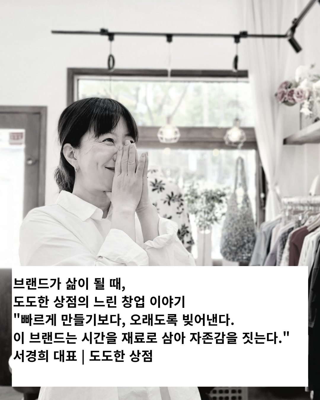 서경희 대표 소개 서경희 대표의 도도한 상점은 47세 창업에도 '거북이 경영'으로 느리지만 단단히 성장한 사례입니다. 이 브랜드는 단기 매출보다 '돈보다 사람, 성과보다 태도'를 중시하며, 고객을 단순한 소비자가 아닌 '이웃'으로 여기며 관계를 맺습니다. 또한, 합리적인 가격으로 고객의 자존감을 높이는 제품을 제공하고자 합니다.