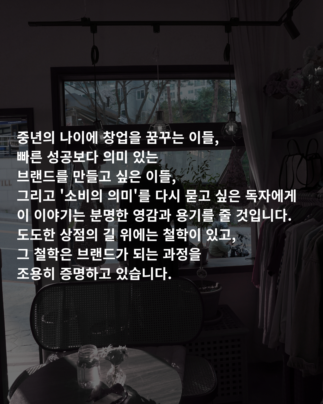 이는 빠른 성공 대신 철학적 기반 위에서 진정성과 일관성으로 오래가는 브랜드를 만들고자 하는 창업 준비자에게 큰 영감과 실질적인 방향성을 제시할 것입니다.