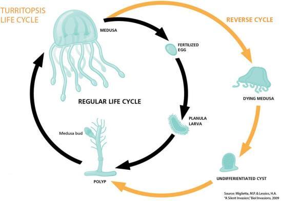 스스로 생명의 스위치를 절전 모드로 변환하여 생명 에너지를 보존하는 것이다. 해파리의 일종인 투리토프시스 누트리큘라(Turritopsis Nutricula)는 성숙 단계에 도달한 후에 다시 폴립(pol-yp, 강장동물의 기본 체형) 상태로 되돌아가면서 죽지 않는 것으로 알려졌다. 이론적으로 이런 과정을 무한히 반복하는 해파리는 지구상에서 영생불사(永生不死)할 수 있는 유일한 생물체다.