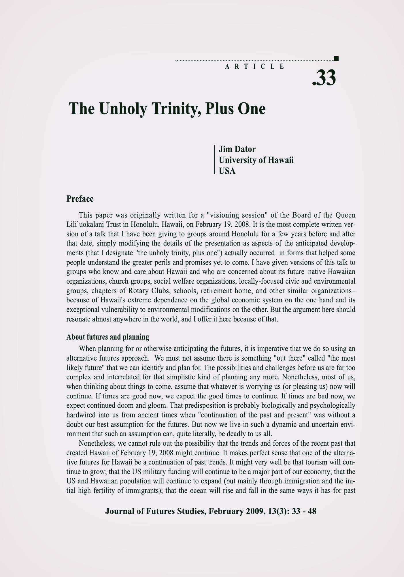 이것은 하와이대학의 교수로 재직 중인 제임스 데이터가 본래 하와이의 퀸 릴리우오칼라니 재단(Queen Liliuokalani Trust) 이사회의 비저닝 세션(visioning session)을 위해 쓴 것을 정리하여 <Journal of Futures Studies>에 기고한 글이다. 그는 글의 서두에서부터 미래를 대충 낙관하기만 하는 인류가 맞게 될 거대한 세 가지 쓰나미에 대해 그가 살고 있는 하와이를 예로 들며 경고하고 있다.