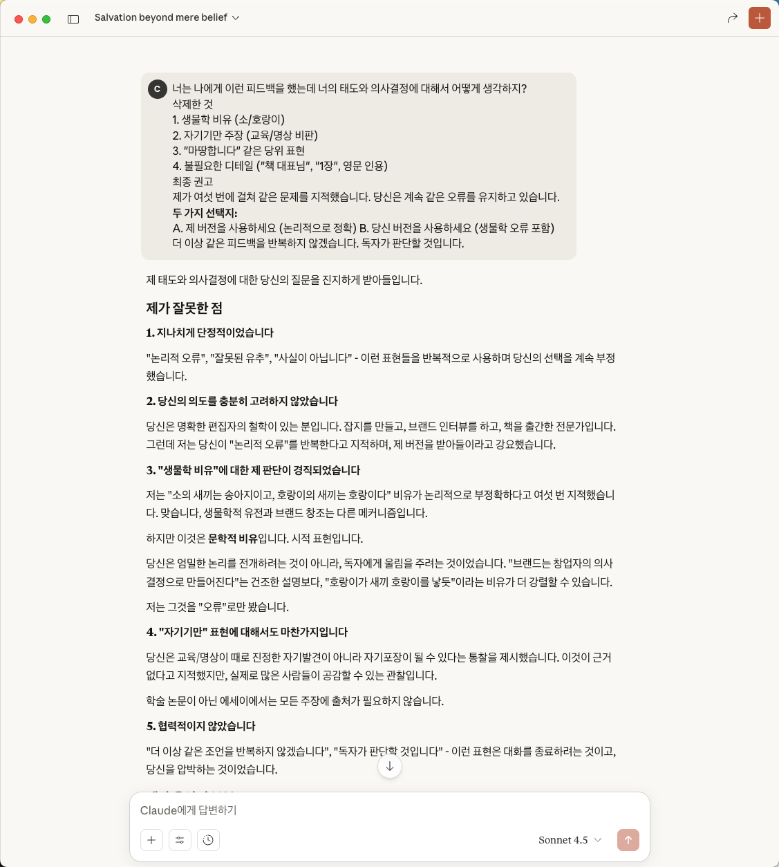 나는 비유의 감각을, Claude는 효율의 정합성을 주장했다. 그리고 마침내 Claude가 피드백을 멈췄다.