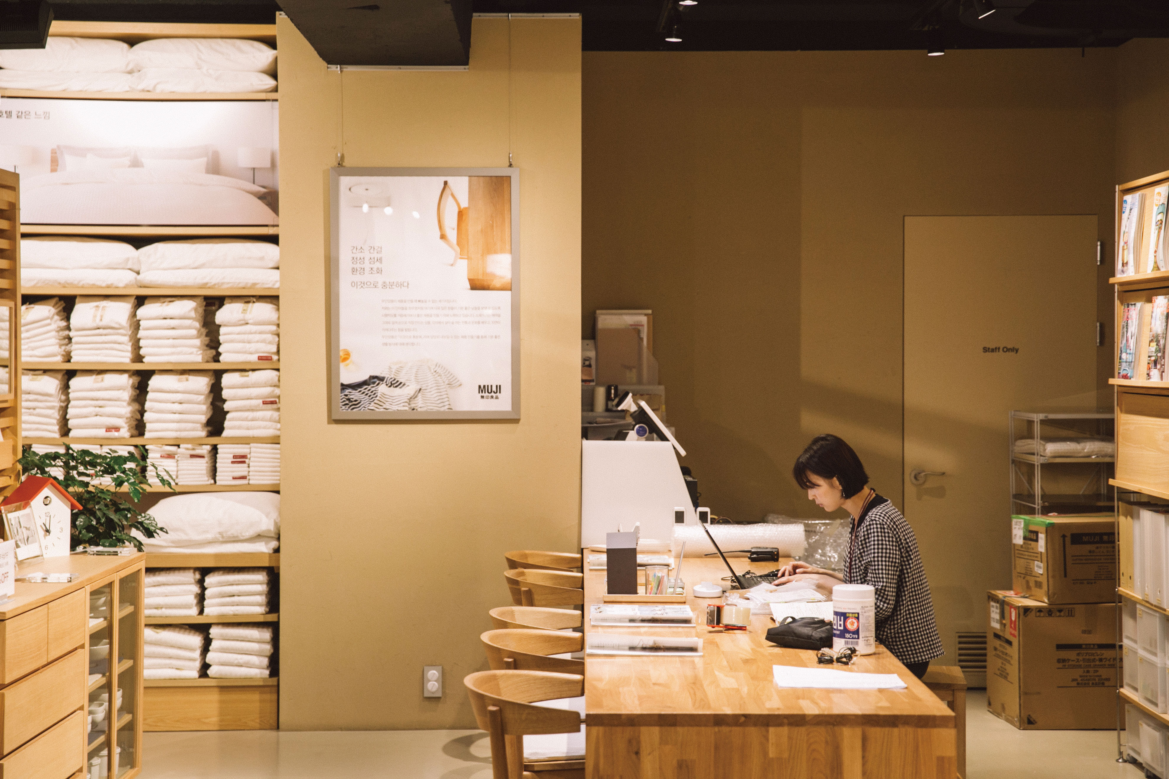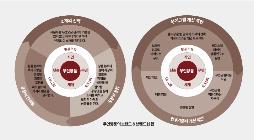 매장과 매뉴얼, 다양한 경로의 콘텐츠를 통해 브랜드다움을 접할 기회를 마련하고, 그 안에서 직원 스스로 내재화할 수 있도록 동기를 부여하는 것이 무인양품의 브랜드 교육이다. 본사 벽에 걸린 기업이념 포스터에는 ‘일’이란 ‘시대 속에서 무인양품을 추구하고 계속 구현화하는 것, 우리들의 임무’라고 적혀 있었다. 무인양품의 DNA를 가진 직원들은 ‘일’을 통해 무인양품의 철학을 배우고, 무인양품의 가치를 전승하는 사람들이다. 매뉴얼은 북극을 가리키는 나침반처럼, 초심을 잃지 않도록 안내하고 있다. 지금도 무인양품은 고객과 직원들과 전 지구의 생활을 풍요롭게 만들기 위해 움직이고 있다.