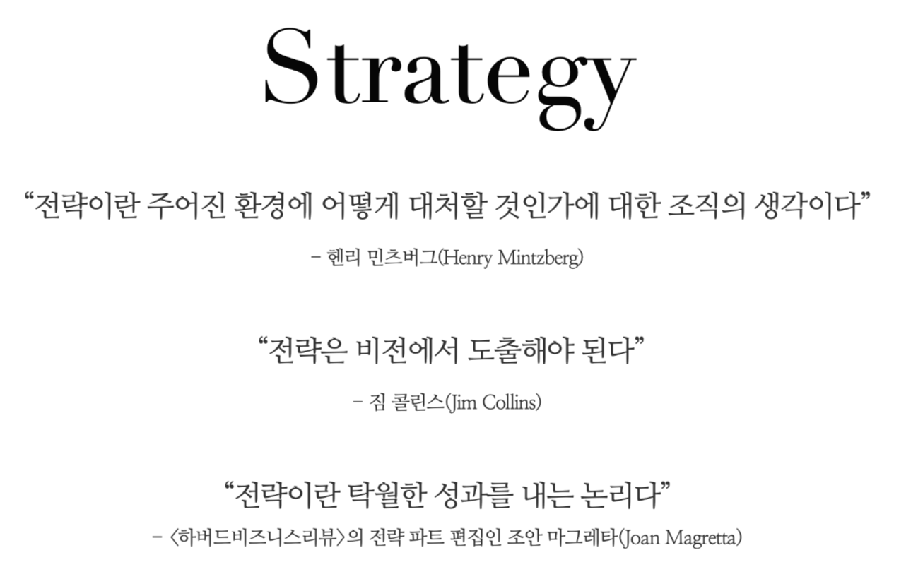 헨리 민츠버그(Henry Mintzberg) 교수는 “전략이란 주어진 환경에 어떻게 대처할 것인가에 대한 조직의 생각이다”고 했고, 위대한 기업의 전도사인 짐 콜린스(Jim Collins)는 “전략은 비전에서 도출해야 된다”고 말했다. 그런가 하면 탁월한 전략에 관한 많은 논문을 보았으리라고 짐작되는 <하버드비즈니스리뷰>의 전략 파트 편집인 조안 마그레타(Joan Magretta)는 “전략이란 탁월한 성과를 내는 논리다”고 정의했다. 이 말들만 보아도 전략에 대해 얼마나 다양한 관점으로 얘기하는지 충분히 알 수 있을 것이다.