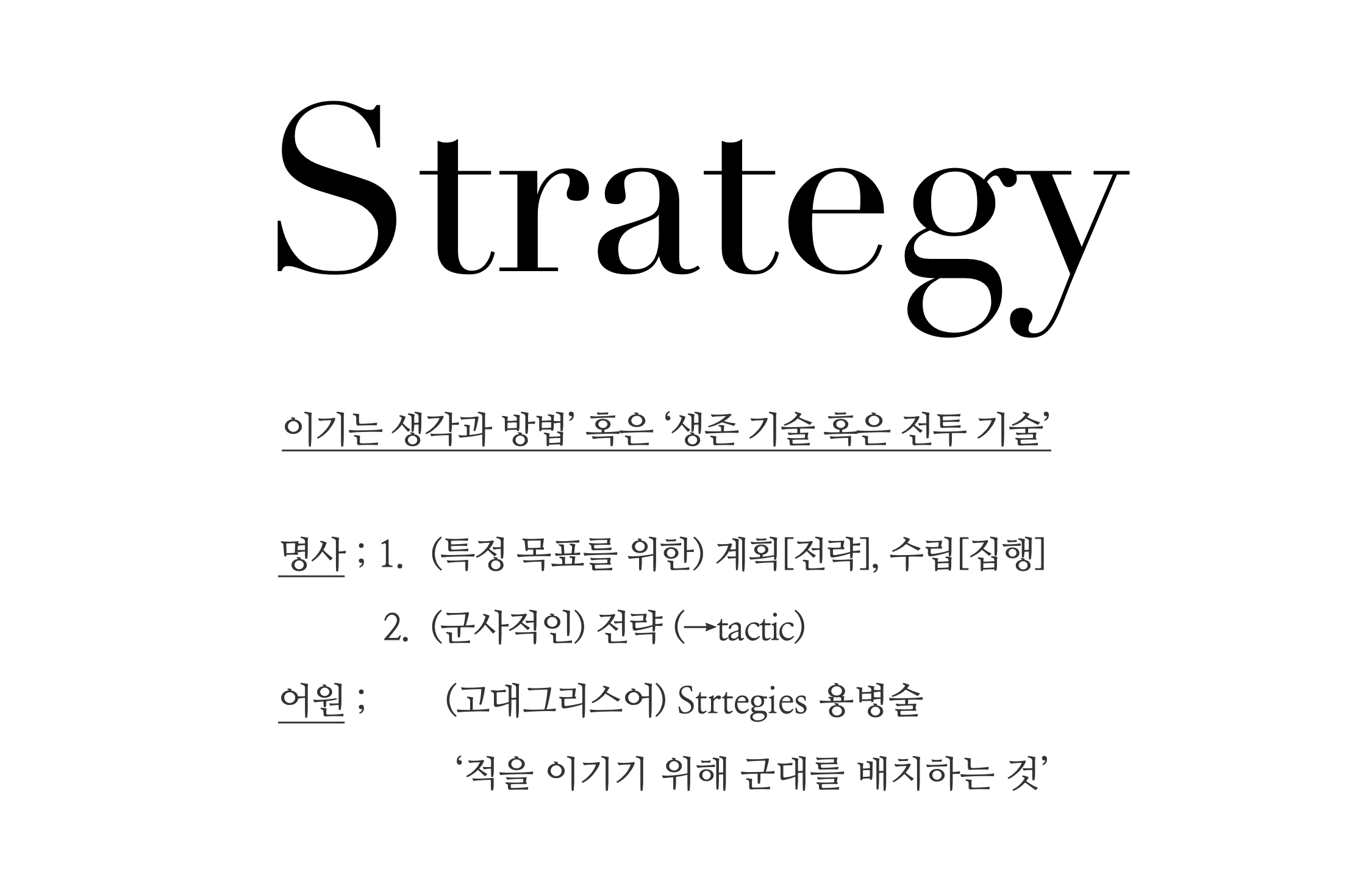 전략에 관한 정의도 브랜드만큼이나 아주 많다. 전략(Strategy)의 어원은 ‘용병술’이라는 의미를 가진 고대 그리스어 ‘Strtegies’다. 정확한 뜻은 ‘적을 이기기 위해 군대를 배치하는 것’이다.