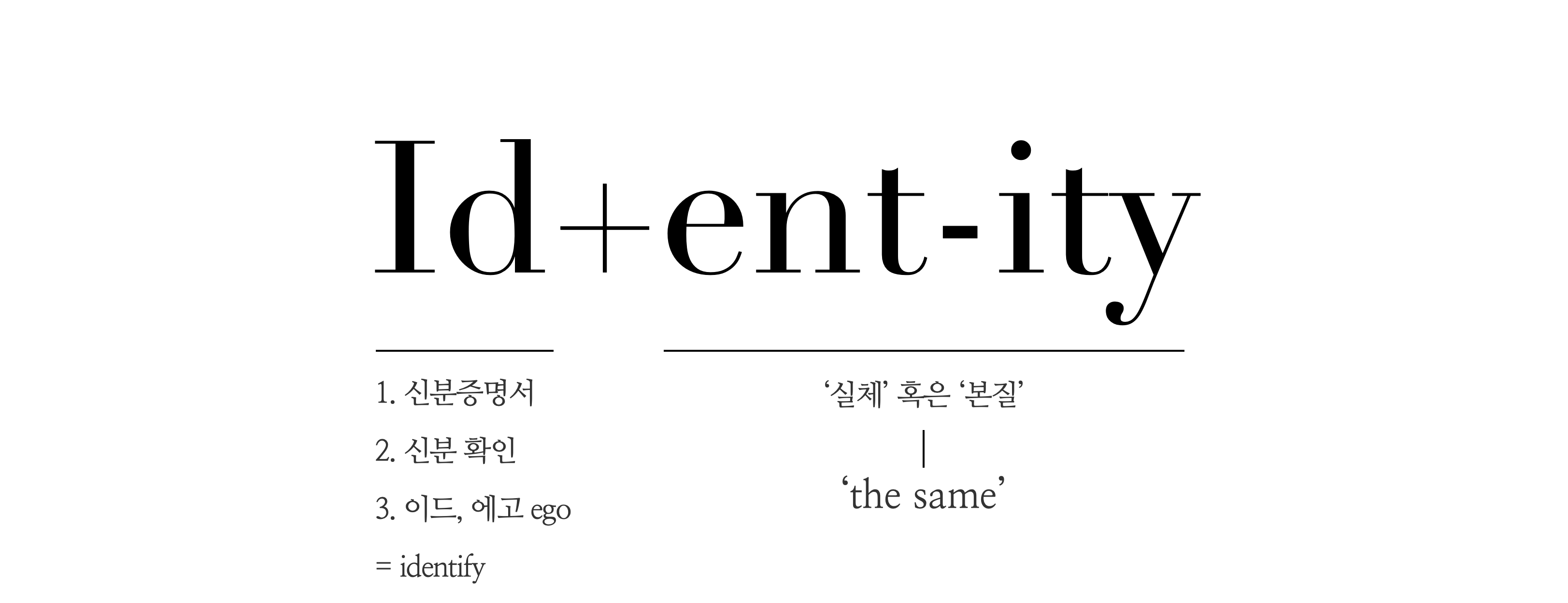 브랜드에서 궁극의 차별화라고 불리는 아이덴티티(Identity)라는 단어를 해부해 보면, 놀랍게도 사람에 관한 ‘자기다움’과 같은 DNA 구조가 있음을 볼 수 있다. 아이덴티티는 라틴어가 어원으로서 수천 년 전에는 고대 철학자들이 identitatem, identitas로 사용했다. 이 단어의 어근인 ident와 비슷한 의미가 있는 단어를 살펴보면 idem(같은 저자, 약자로 ID)이다.