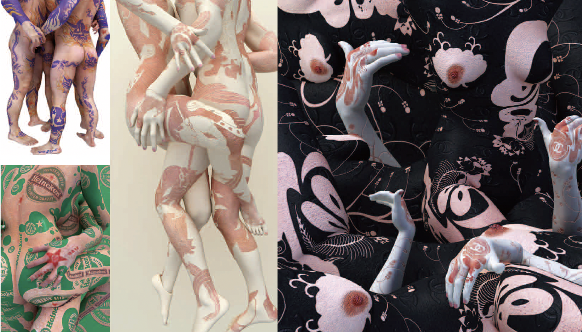 UnitasBRAND 교수님의 수많은 작품 속에 등장하는 조금은 에로틱한 남녀의 몸이 실제 사람 몸이 아닌 3D 컴퓨터 그래픽으로 구현한 가상의 몸이라는 점에서 매우 놀랐습니다. 그런데 그중 유독 눈에 들어오는 작품이 하나 있더군요. 바로 구찌, 아디다스, 스타벅스 등 유명 브랜드의 로고들이 온몸에 새겨져 있는 작품이었죠. 이 작품의 의미를 알고싶습니다.