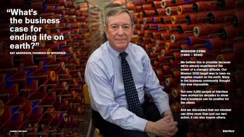 2009년, 인터페이스의 창업자 레이 앤더슨(Ray Anderson)은 TED컨퍼런스에서 ‘지속가능성의 기업적 논리(The business logic of sustainability)’의 주제로 연설을 했는데, 수천 명의 청중을 앞에 두고 이렇게 고백했다.