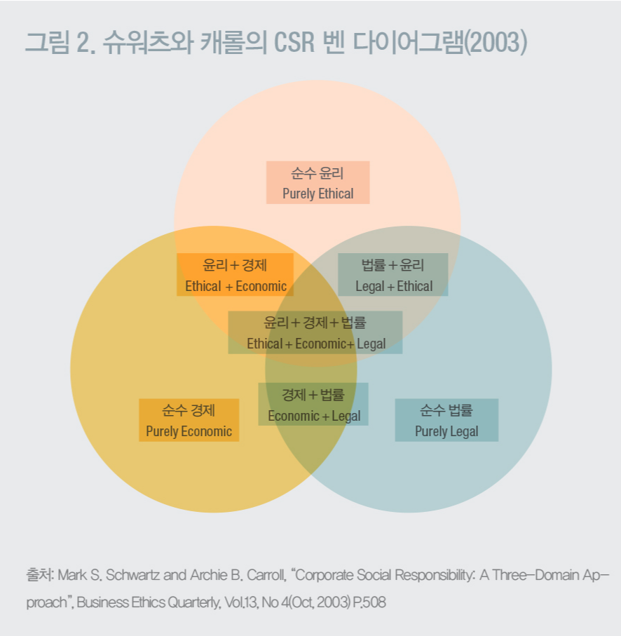 2003년은 캐롤은 CSR 피라미드를 보완해서 마크 슈워츠(Mark Schewartz)와 공동으로 각각의 영역이 중첩되는 (그림 2) CSR 벤 다이어그램을 제시했다. 이때 슈워츠와 캐롤은 기존 피라미드의 최상위층에 위치한 ‘자선적 책임’의 항목을 삭제한다. 그들은 시대의 흐름이 변화하며 CSR은 이제 자선은 같은 의무의 범위를 벗어난 바람직한(desirable) 행위로 이해했기 때문이라고 설명했다.