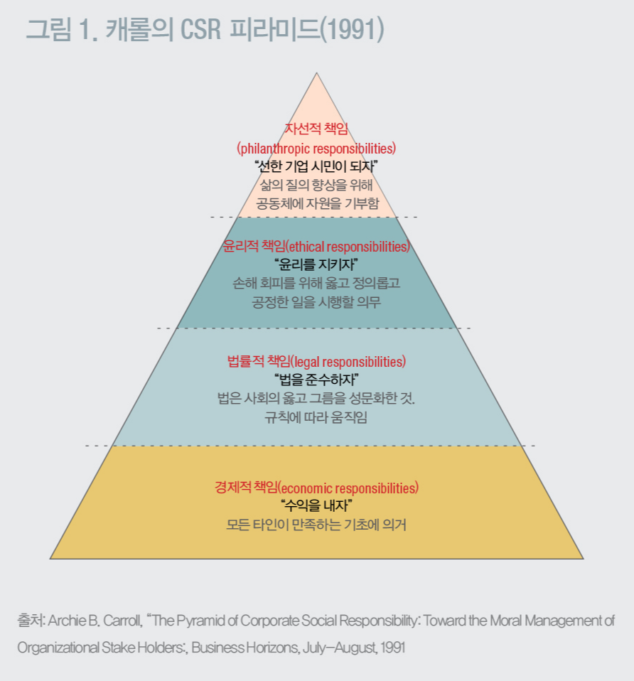 기업의 사회적 책임(Corporate Social Responsibility) 이론 1991년, 미국의 캐롤(Archie B. Carroll)은 1991년 기업의 사회적 책임의 단계를 규명한 (그림1) CSR 피라미드를 발표했다. 기업의 사회적 책임을 각각 경제적, 법률적, 윤리적, 자선적 책임으로 분류한 이 피라미드는, 기업활동이 두 가지 이상의 영역을 충족시킬 때, 영역이 중첩되는 경우를 표현하는 데 한계가 있었다.