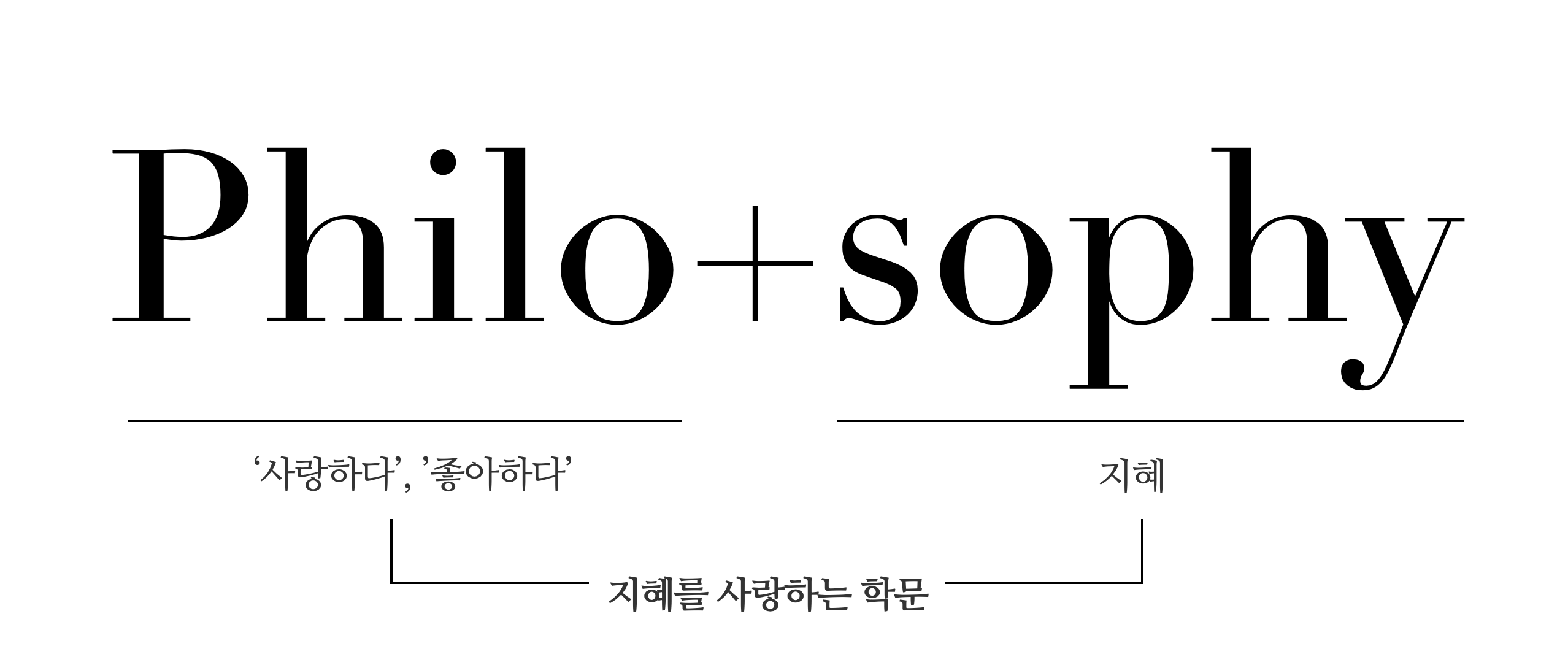 소크라테스가 말하는 철학(Philosophy)은 그리스어인 필로소피아(philosophia)에서 유래한 단어로, 필로(Philo)는 ‘사랑하다’ ‘좋아하다’는 뜻의 접두사이고 소피아(Sophia)는 ‘지혜’라는 뜻이다. 말 그대로 철학은 ‘지혜를 사랑하는 학문’이다.