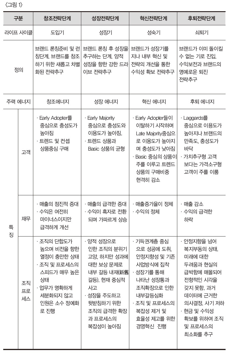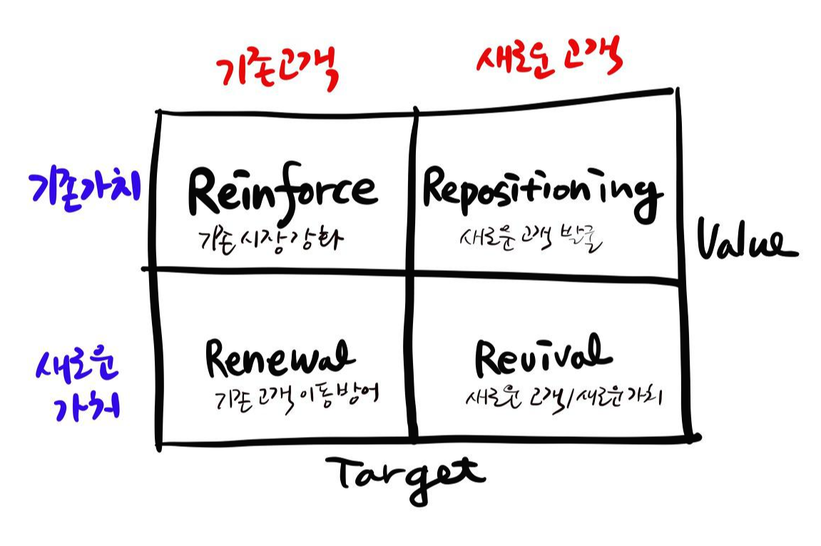 정리한다면 리뉴얼, 리포지셔닝, 레인포스, 리바이벌(그림 1)과 5개의 시점(그림 2)에 따라서 다르다.