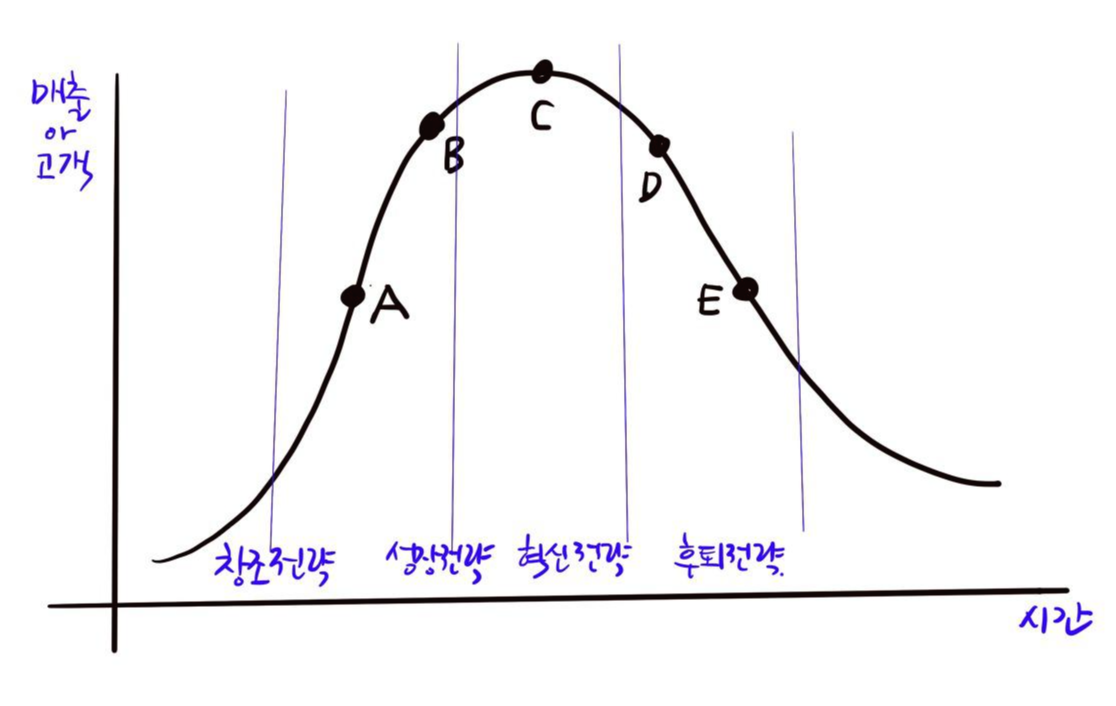 새로운 가치를 기존 고객에게 주어서 기존 고객의 구매를 확대하는 리뉴얼을 어떤 시점에서 하느냐에 따라서 완전히 다른 전략이 된다. 만약에 리뉴얼을 A 시점에서 사용한다면 리뉴얼을 공격형 마케팅 전략이라고 할 수 있다. 그러나 대부분의 사람은 리뉴얼을 D 혹은 E 시점에서 하는 것으로 알고 있다.