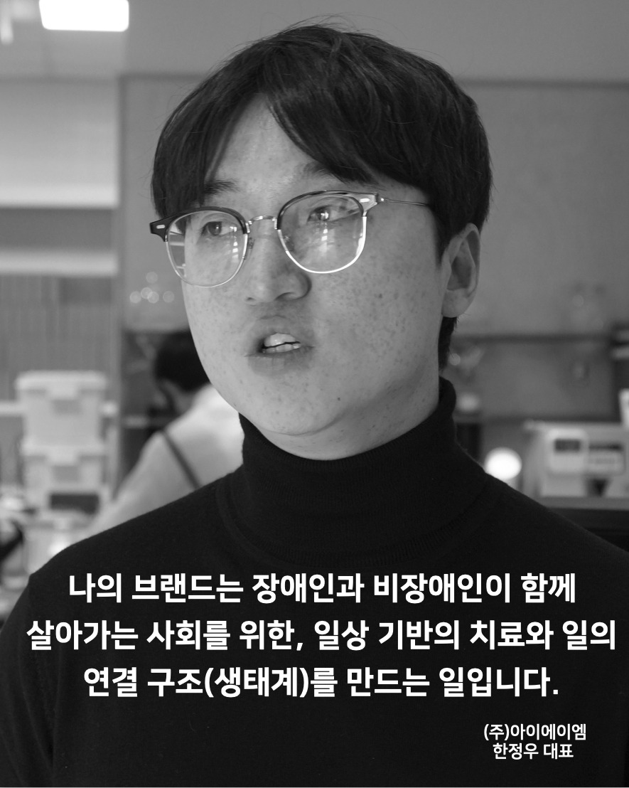 “나의 브랜드는 장애인과 비장애인이 함께 살아가는 사회를 위한, 일상 기반의 치료와 일의 연결 구조(생태계)를 만드는 일입니다.” -(주)아이에이엠 한정우 대표
