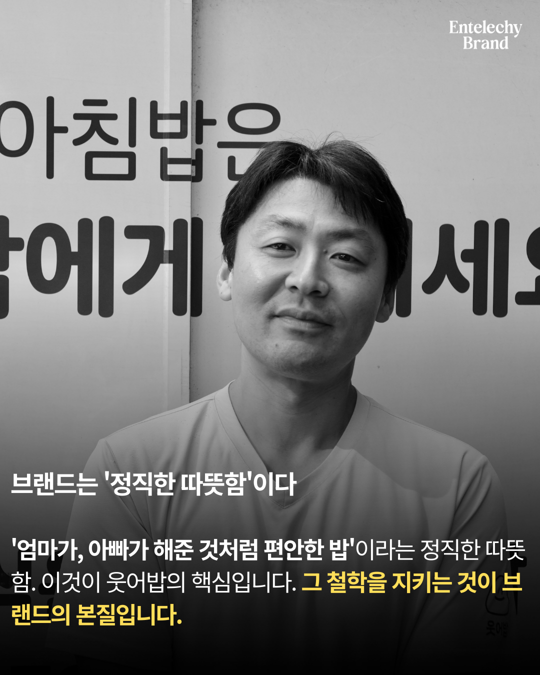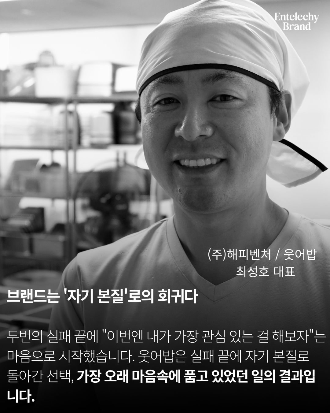 2015년 당시에는 다소 장난스럽게 들렸지만, 묘하게 그의 얼굴과 어울렸다. 브랜드란 이름 값을 하는 것이어야 하는데, ‘웃어밥’은 어떻게 이름 값을 할 수 있을까? 솔직히 말하면 나쁘지도, 그렇다고 아주 좋지도 않았다. 그러나 뭔가 가능성이 보였기에 나는 “좋다”고 대답했다.